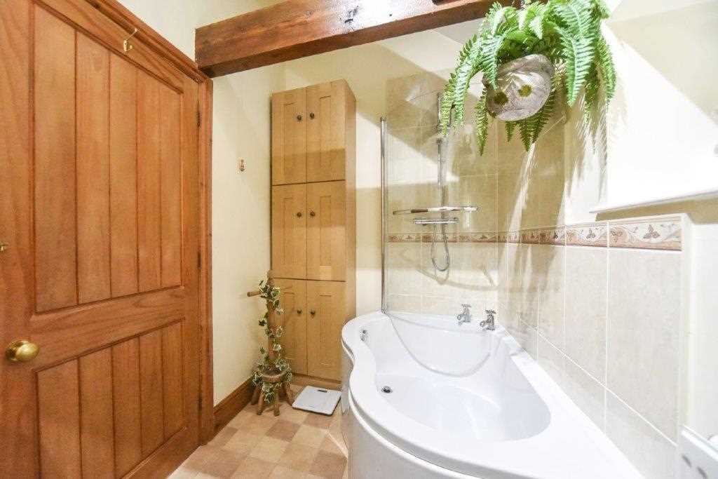 Double glazed obscure window , a well presented bathroom comprising of a curved bath with shower screen and shower over, wash hand basin with storage below and low flush w/c. Radiator.