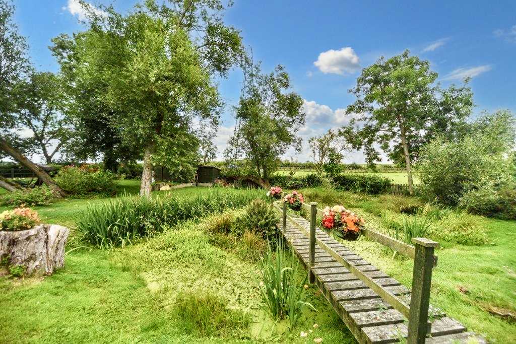 The well presented gardens is designed with a number of seating areas, the garden is mainly laid to lawn with paved walk ways to the summer house and to the wildlife pond. The garden also benefits from a wooden shed and has fenced and hedged borders.