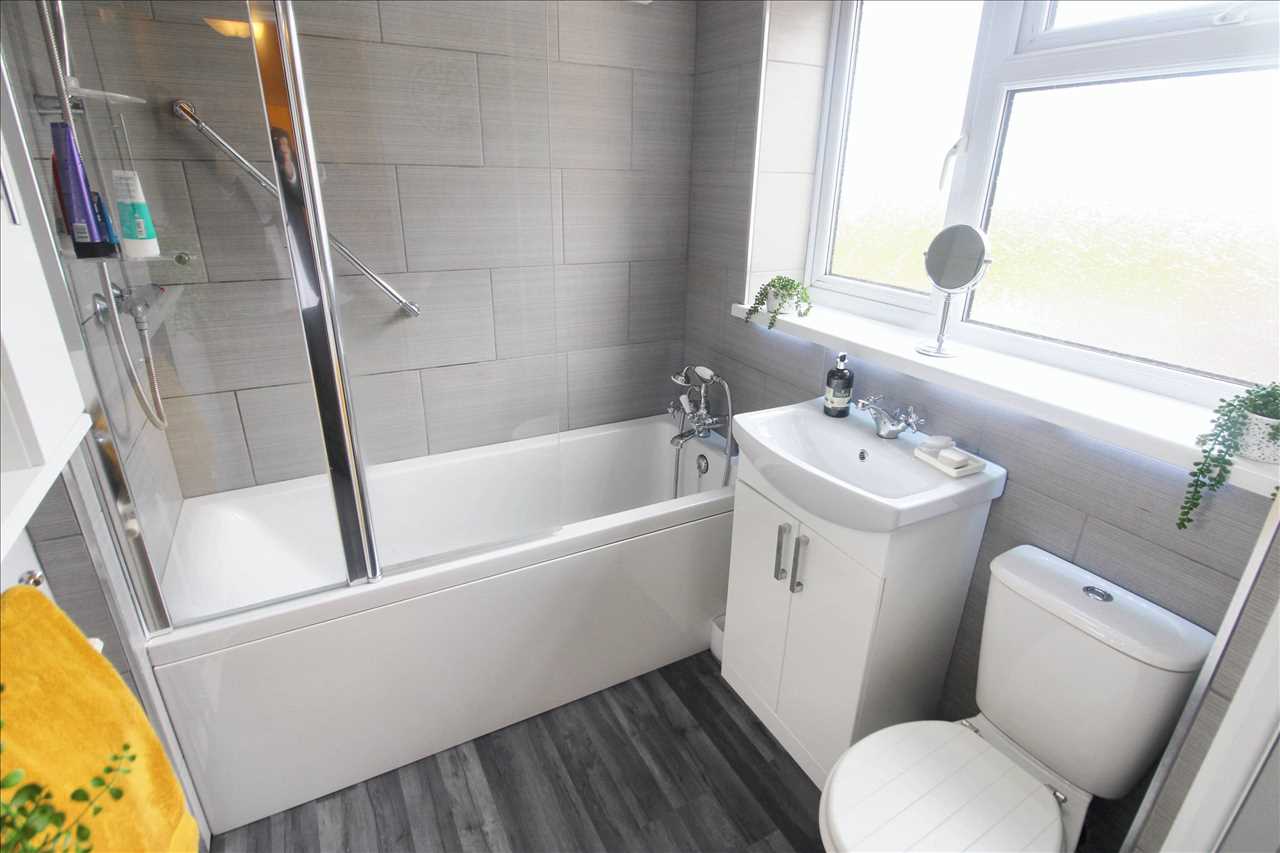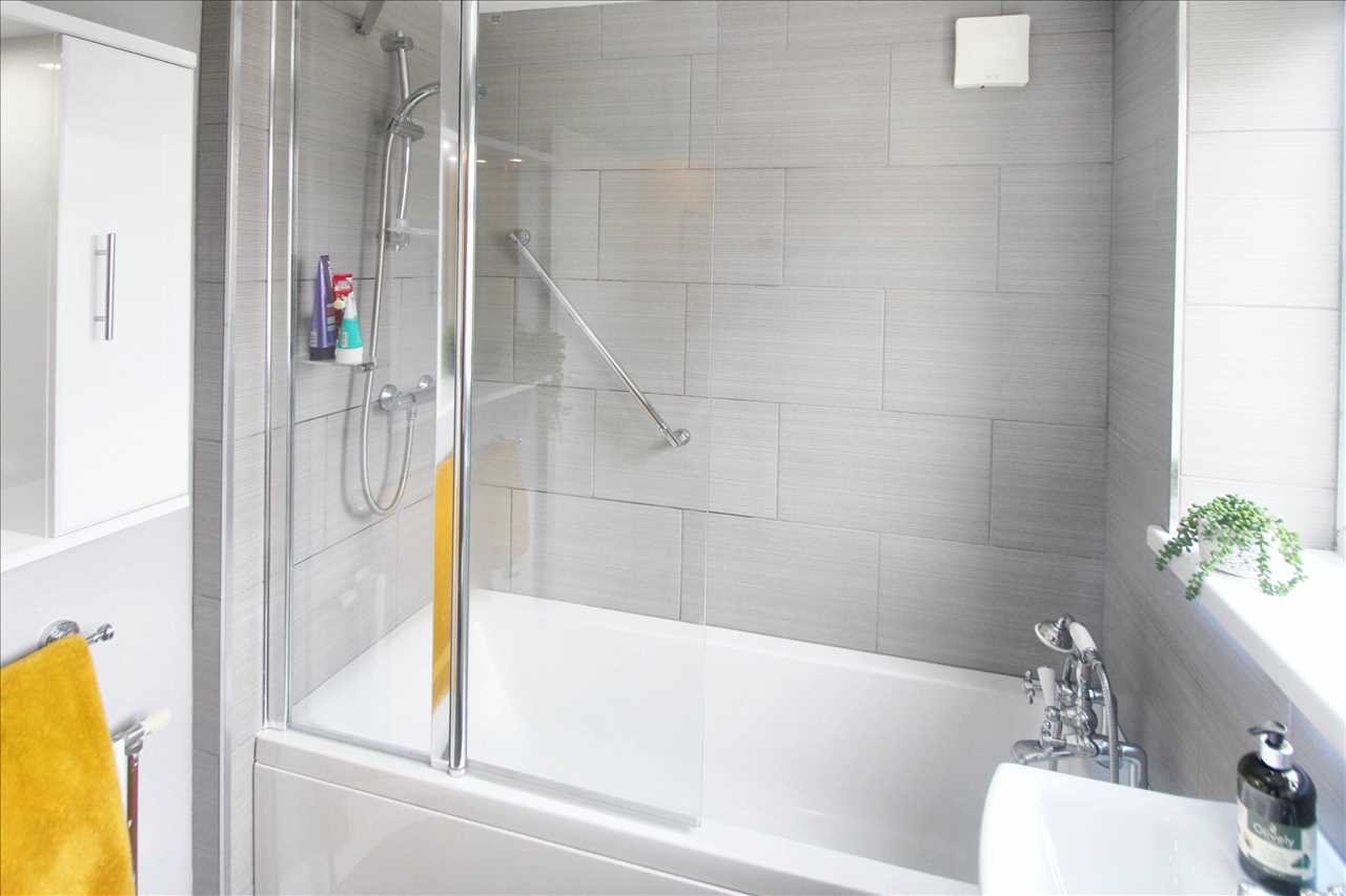 Frosted double glazed window to the rear elevation, white suite comprises of panelled bath with shower over, pedestal wash hand basin, low flush w/c, store cupboard housing combination boiler. Tiling to the walls.