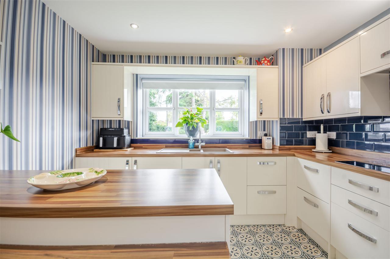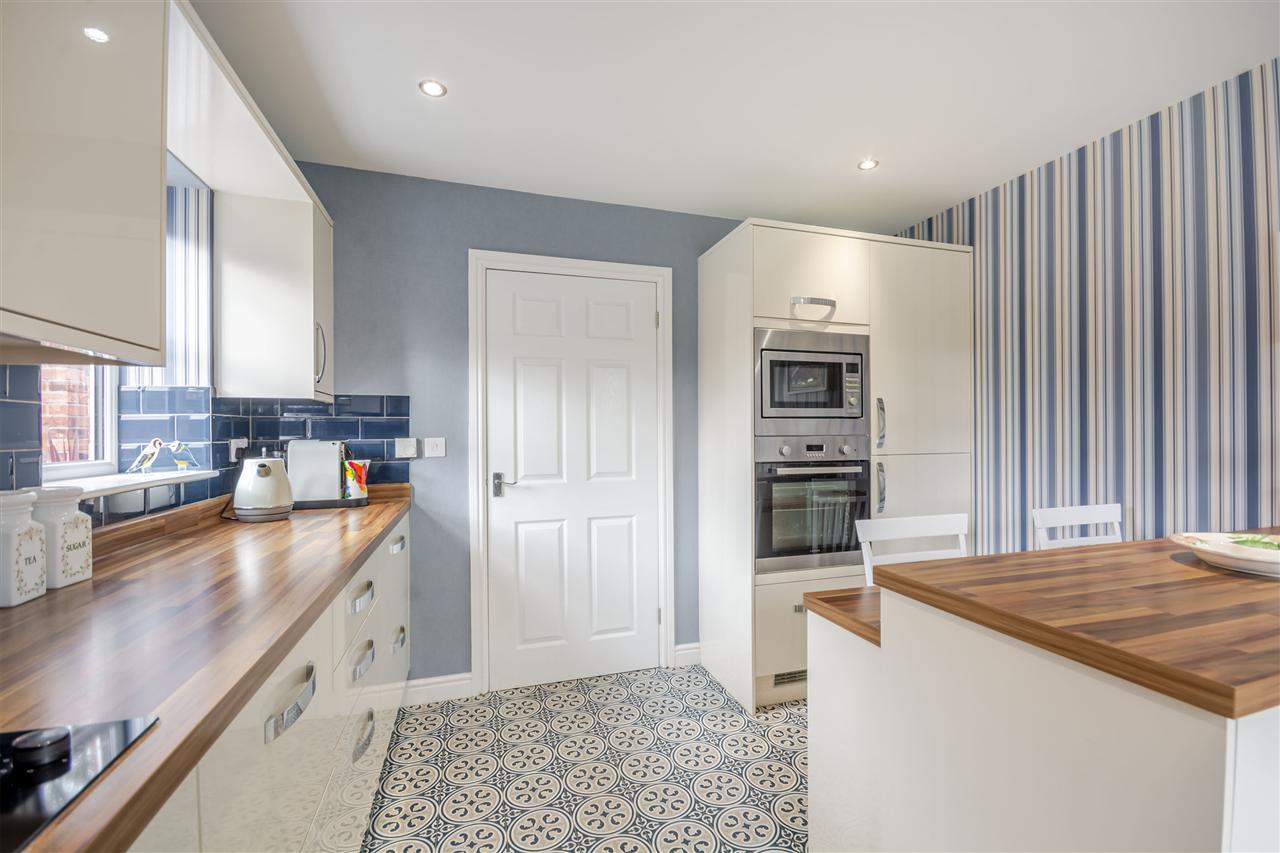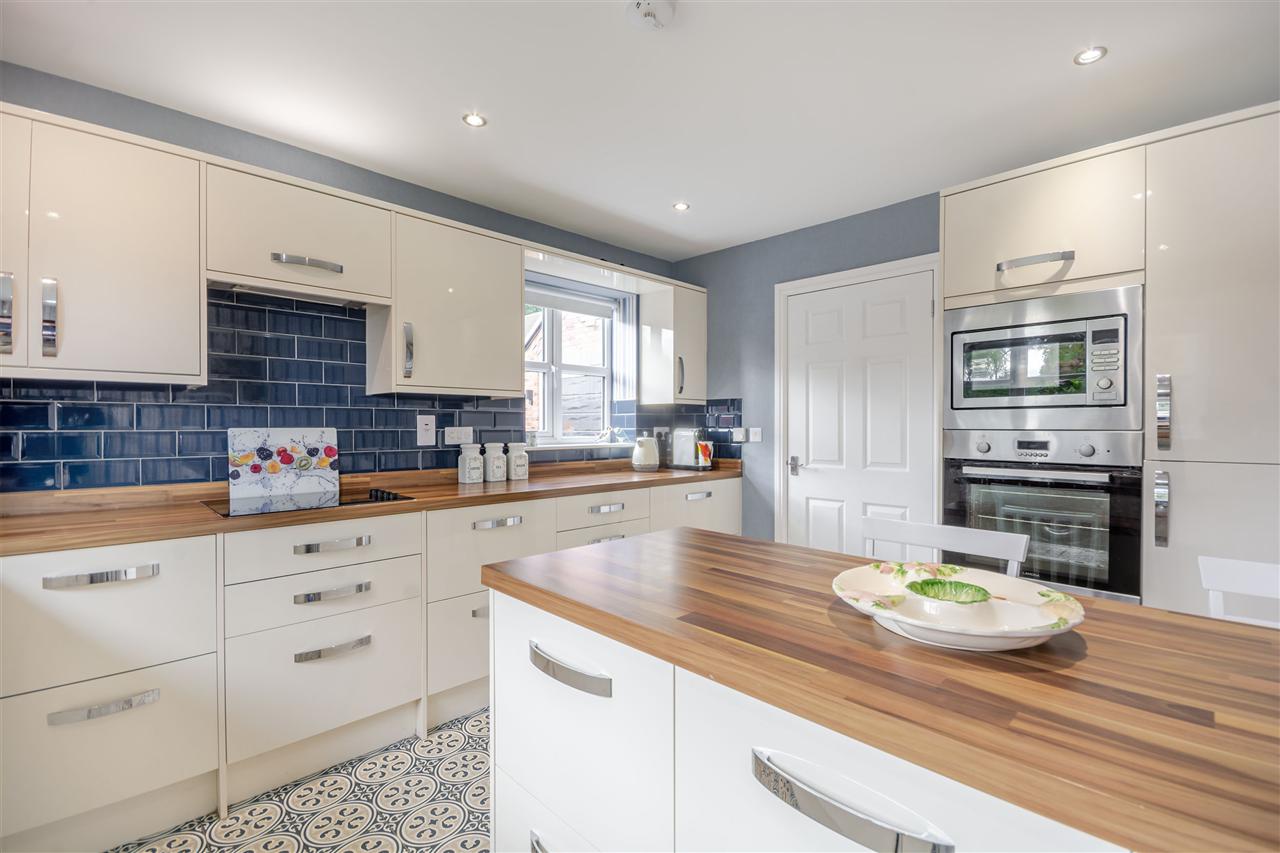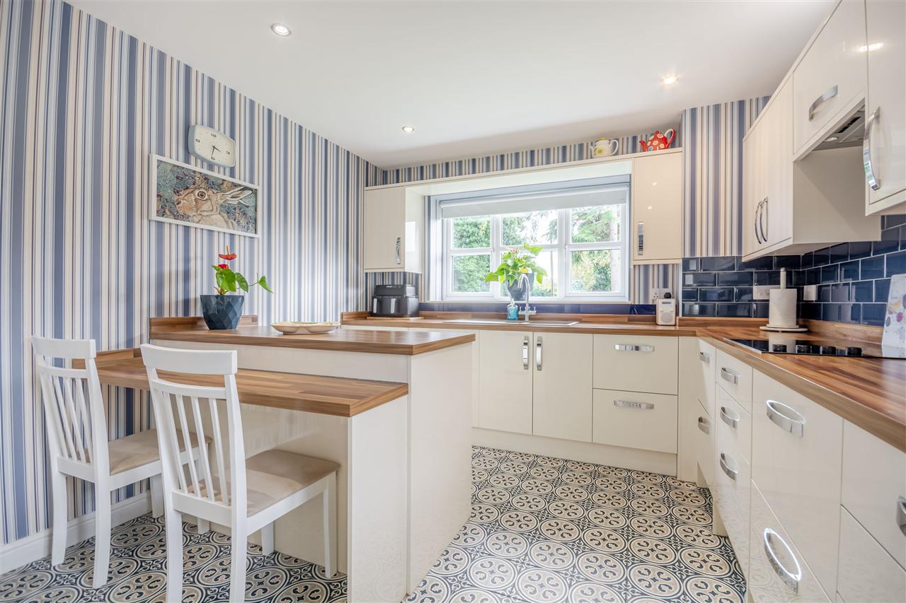 With a range of matching high gloss wall & base units with work surfaces over incorporating an inset one and a half bowl Franke composite sink and drainer unit. Integrated appliances include a waist height electric oven and microwave oven with grill, electric hob with extractor over, fridge freezer, tumble dryer and washing machine. There is a breakfast bar, spotlights to ceiling and uPVC double glazed windows to the rear and side elevations, under floor heating and tiled floor covering
