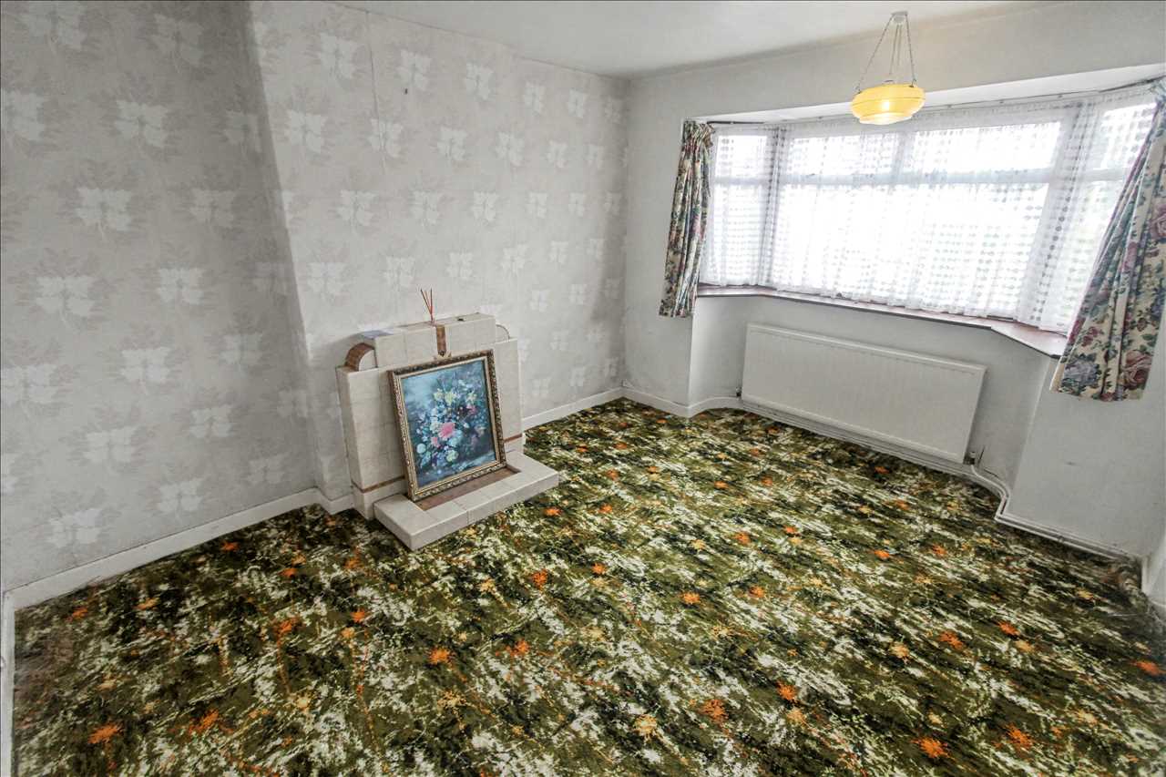 Lawned front garden with pathway to side & hedge boundary. Potential off road car parking.