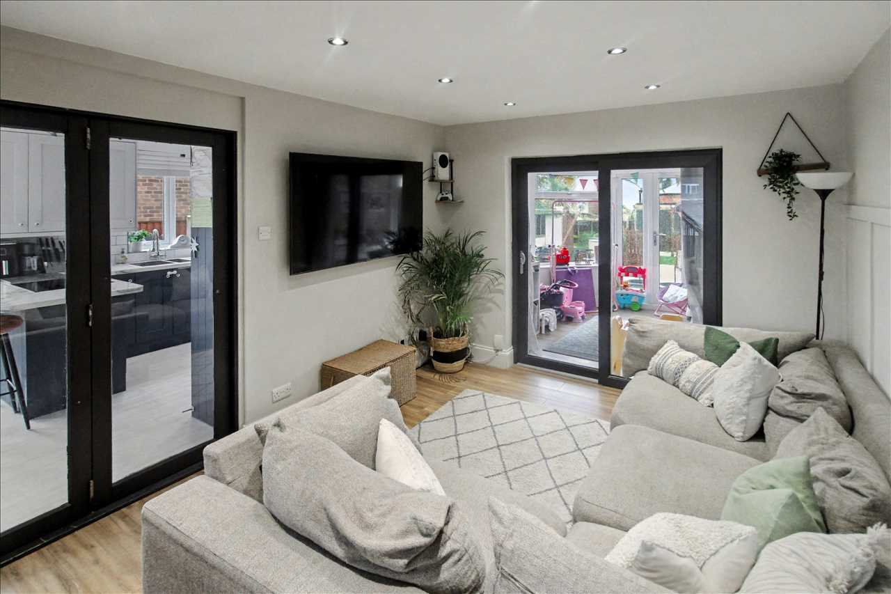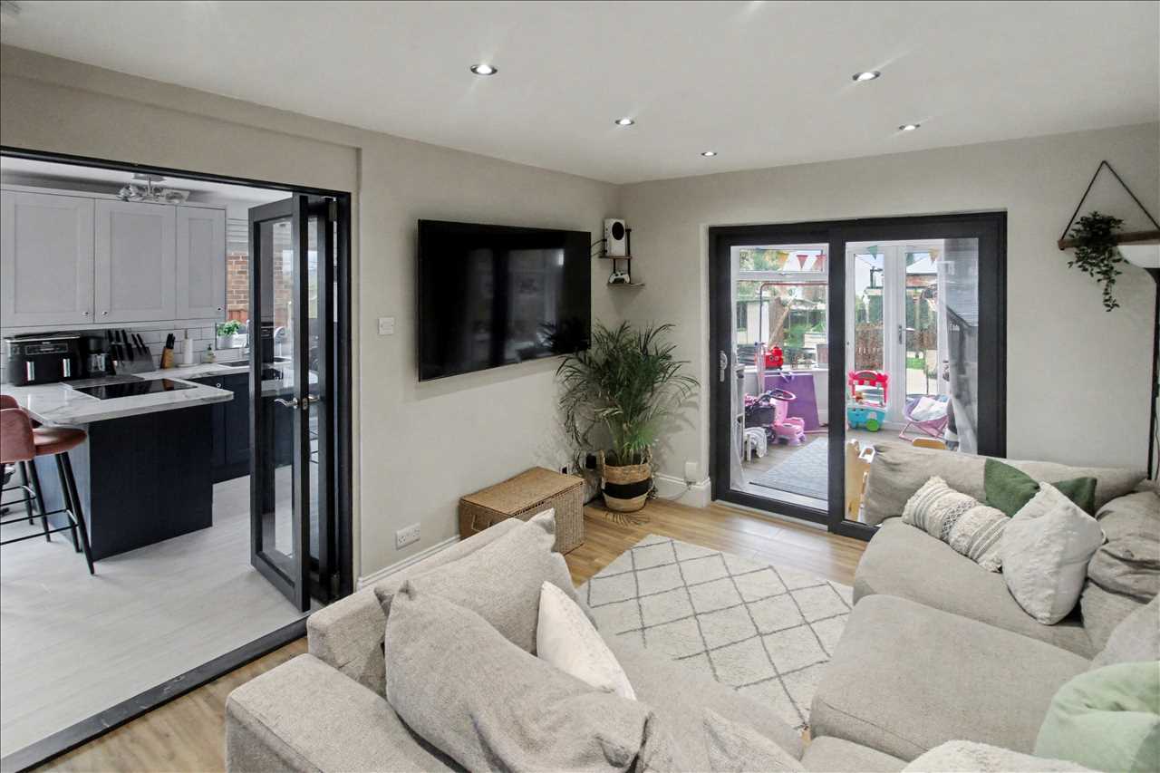 Open plan access from the entrance leads to the beautiful and welcoming lounge. The lounge has a double glazed patio door leading to the conservatory, ceiling spotlights, wood effect laminate flooring, feature vertical radiator and bi fold doors leading to the kitchen/diner.
