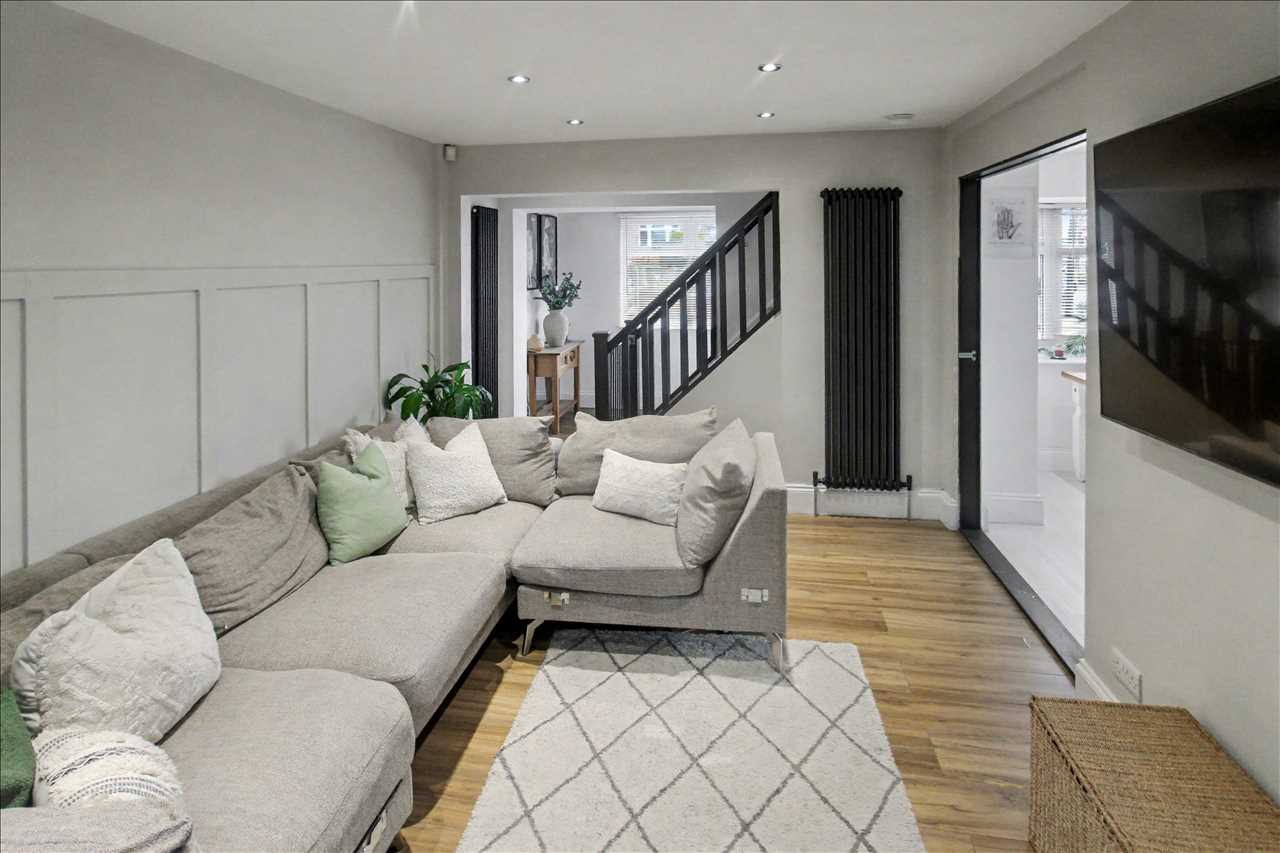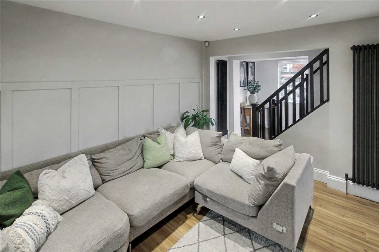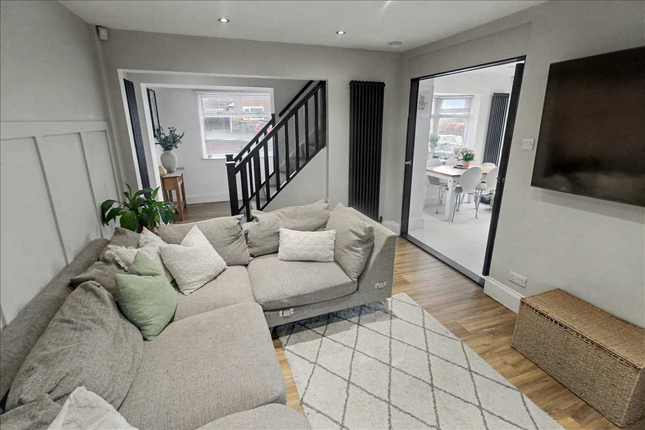 Composite entrance door, uPVC double glazed window to the front, wood effect laminate flooring, ceiling spotlights, stairs to the first floor, feature vertical radiator and open plan access to the lounge