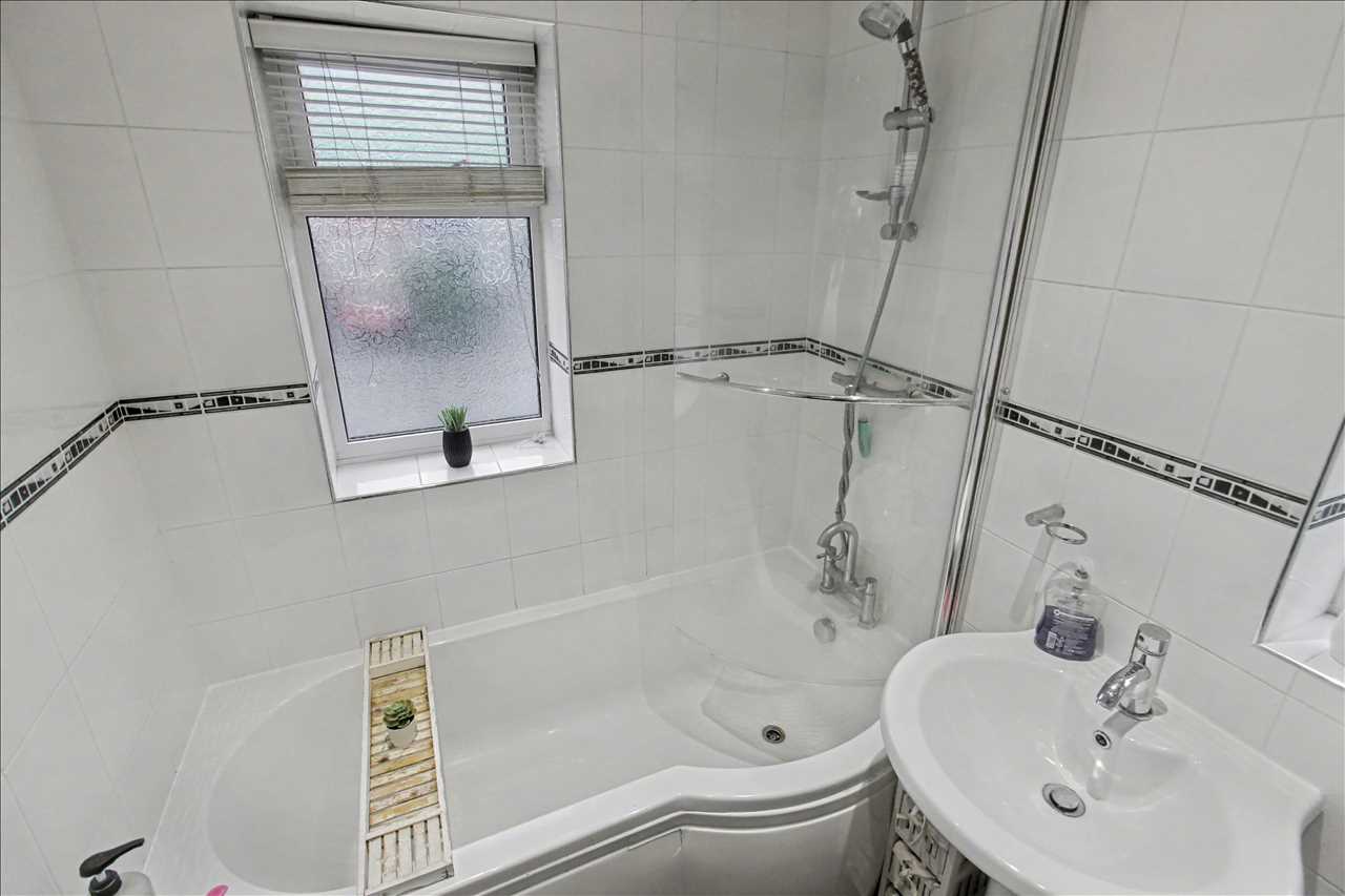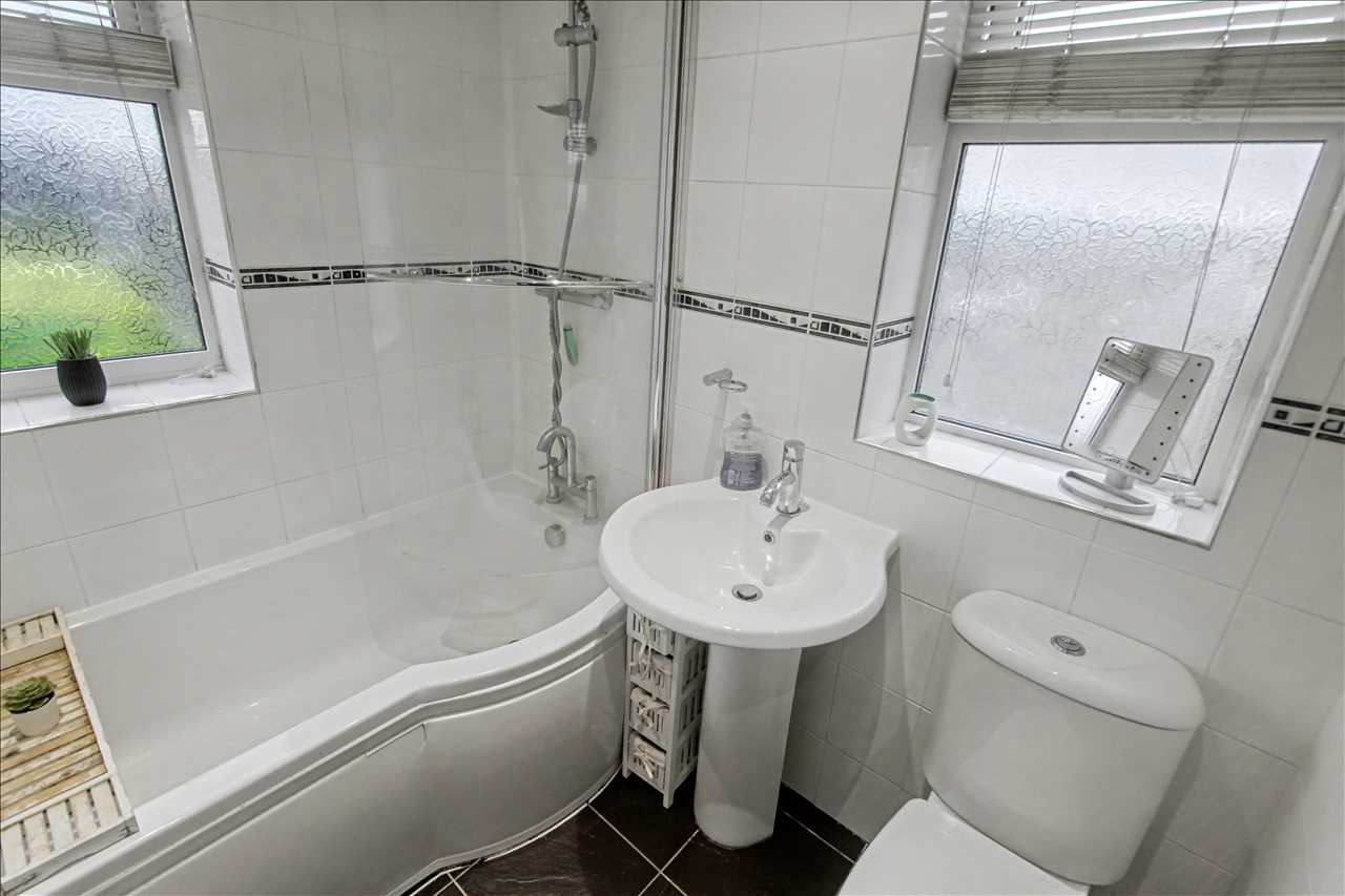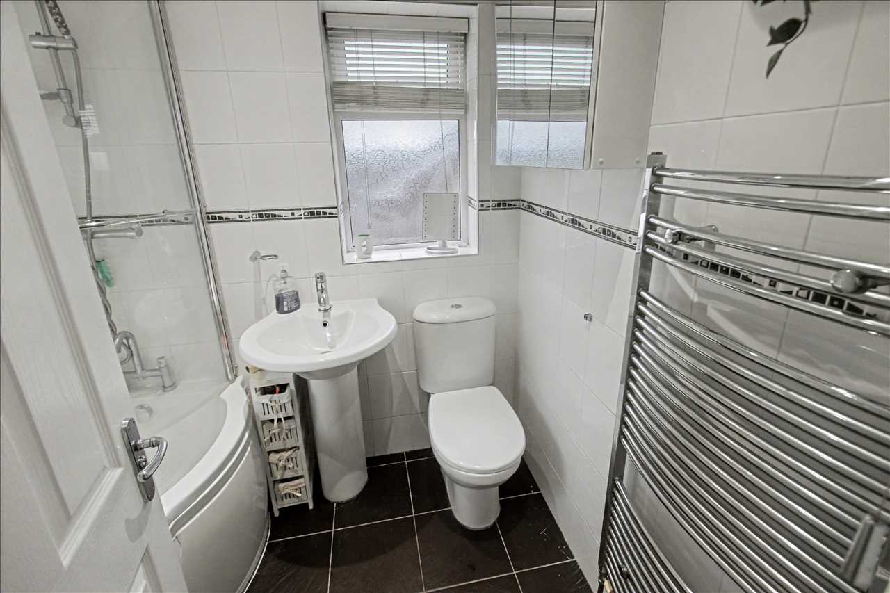 Obscured uPVC double glazed windows to the side elevation and the rear elevation. The white three piece suite comprises of a WC, pedestal wash hand basin and P shaped bath with mains shower over Chrome heated towel rail, ceiling spotlights and extractor fan. Tiling to the walls and tiling to the floor.