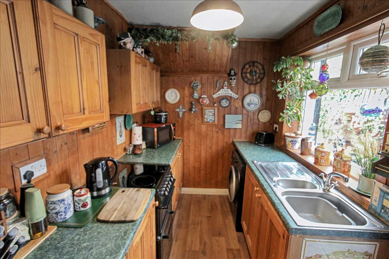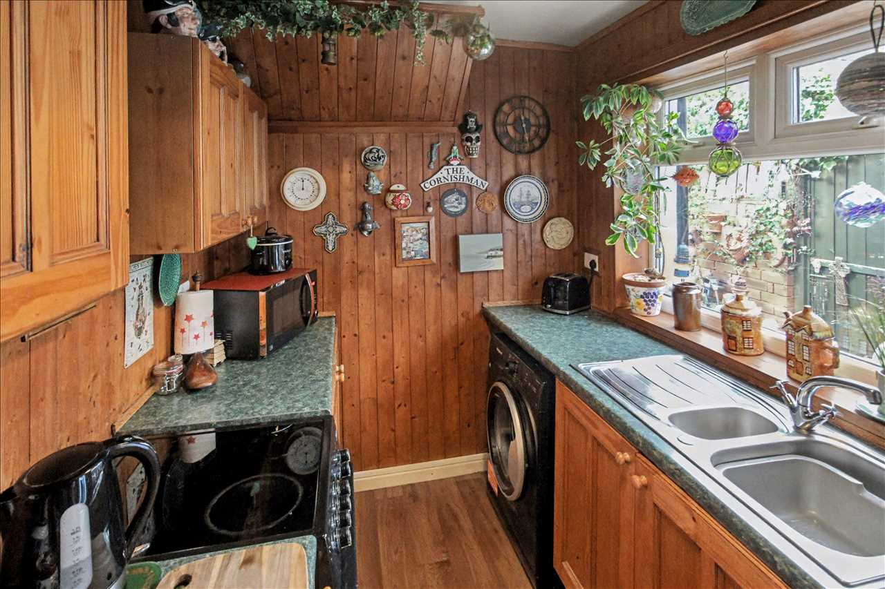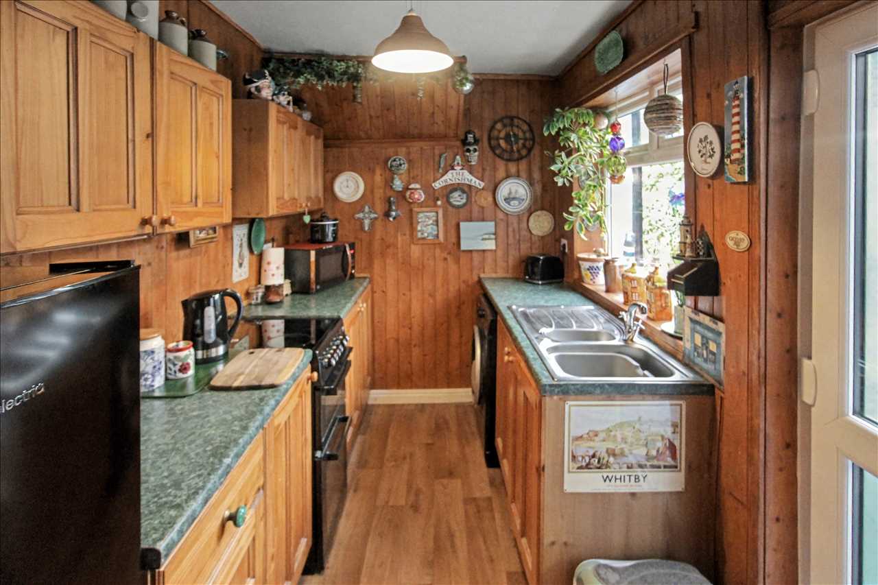 Door to the side elevation leading to the enclosed rear garden. Double glazed window to the side elevation. One and a half bowl sink unit with mixer taps and side drainer inset into work surfaces. A range of base and wall units, space for gas cooker point and plumbing for automatic washing machine.