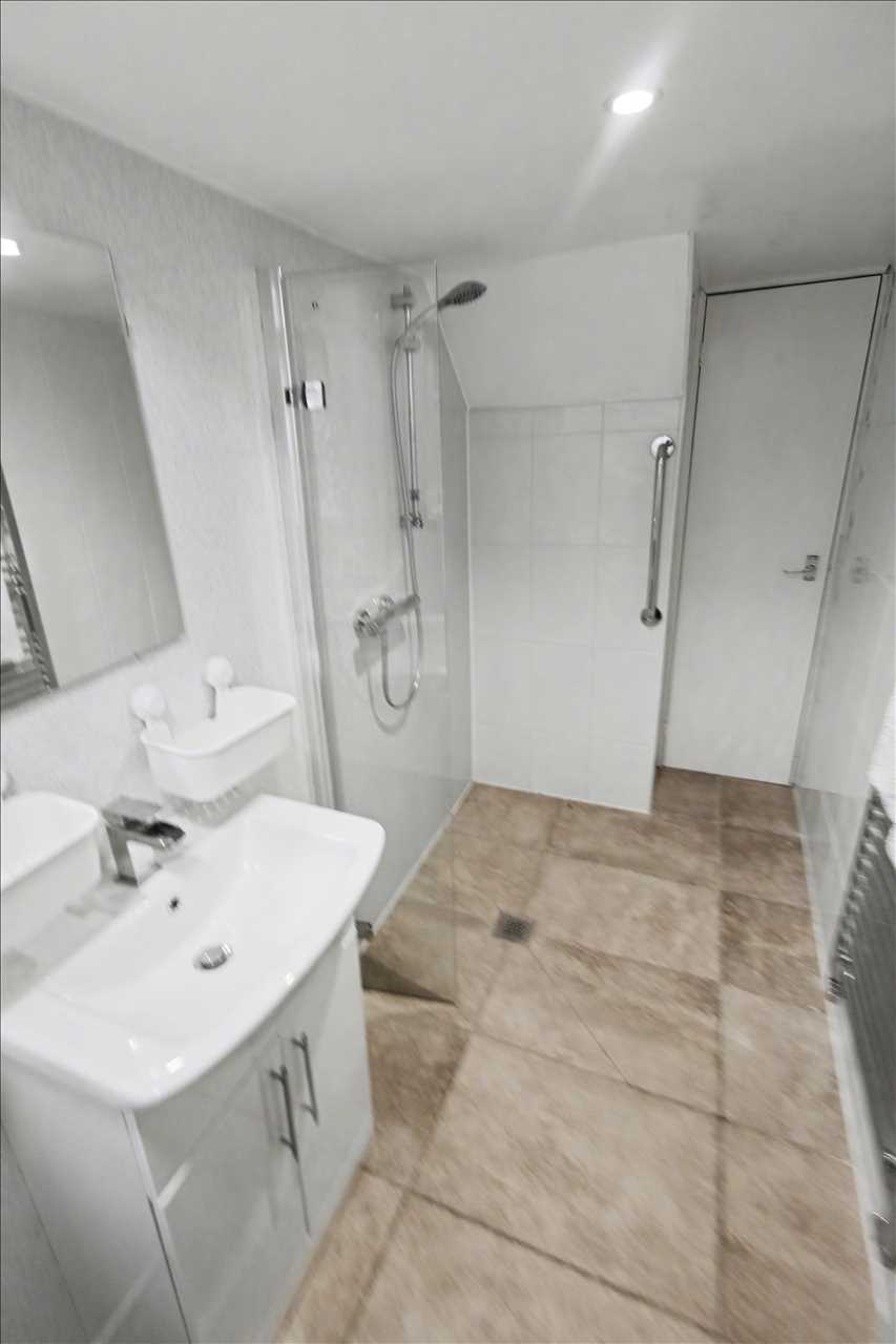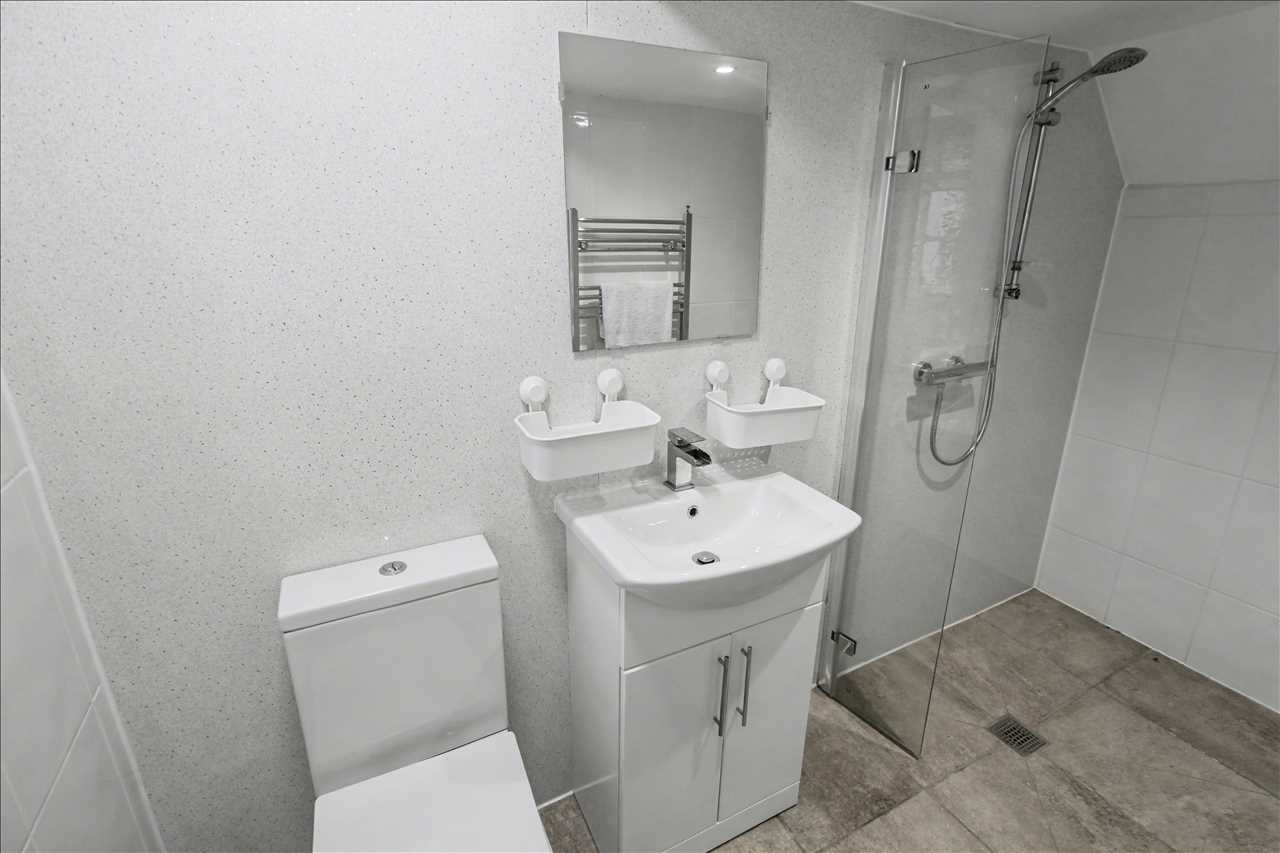 Window to the rear elevation the beautifully re fitted shower room comprises of a low flush wc, wash hand basin with storage below and shower area with shower over and screen. Tiling to the floor, spotlights to the ceiling, storage cupboard and chrome towel rail.