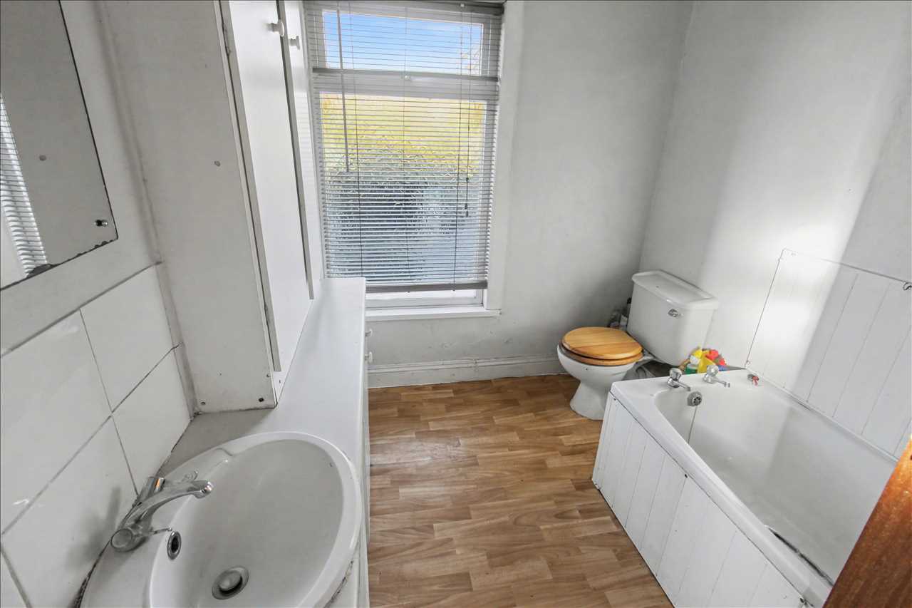 Frosted double glazed window to the rear elevation, white suite comprising of panelled bath, wash hand basin with storage below ad low flush wc. Tiled splash back areas.