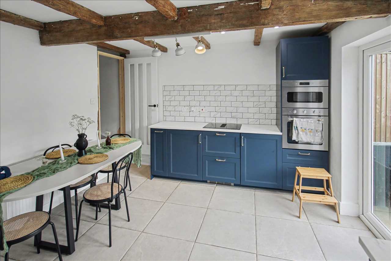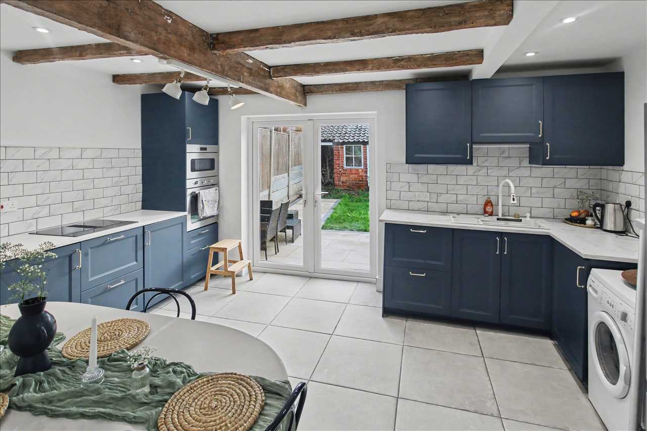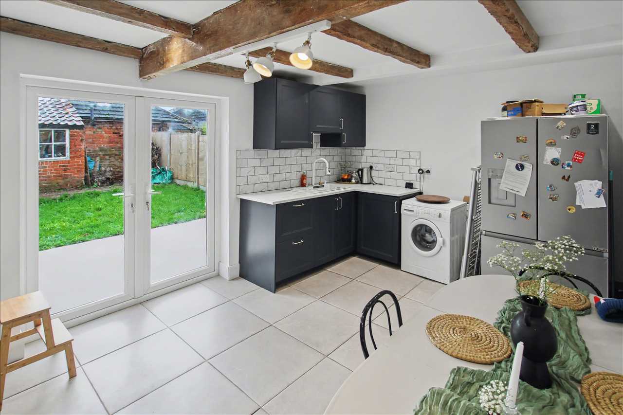 A beautiful, spacious bright re fitted kitchen/diner comprising of a sink unit with mixer taps inset into work surfaces, a range of modern base and wall units with built in double oven, hob, built in dishwasher, plumbing for automatic washing machine, space for American style fridge freezer, tiled splash back areas and tiling to the floor. Spotlights to the ceiling and a beam effect ceiling. French doors opening onto the enclosed rear garden. Staircase to the first floor.