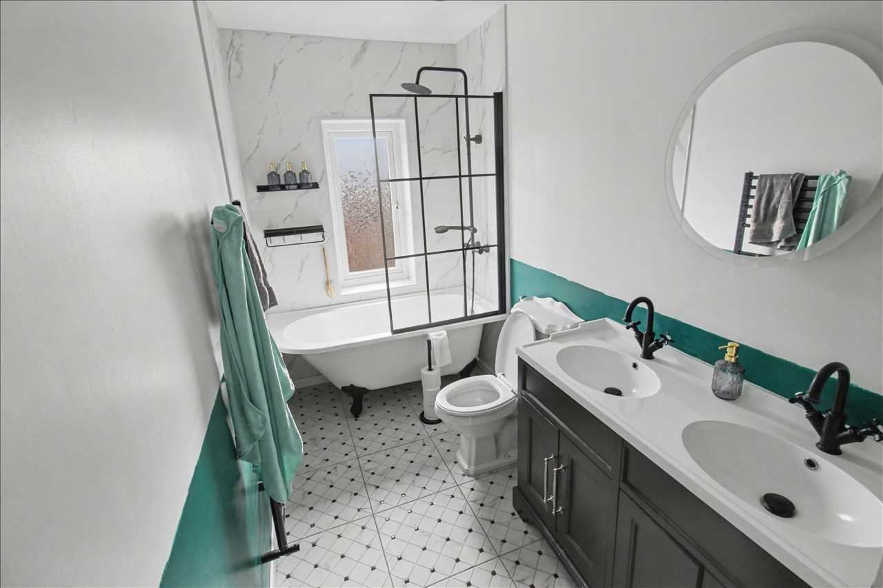 A stunning re fitted bathroom comprising of a feature bath with rainfall shower over, twin sink units and low flush wc. Spotlights to the ceiling.
