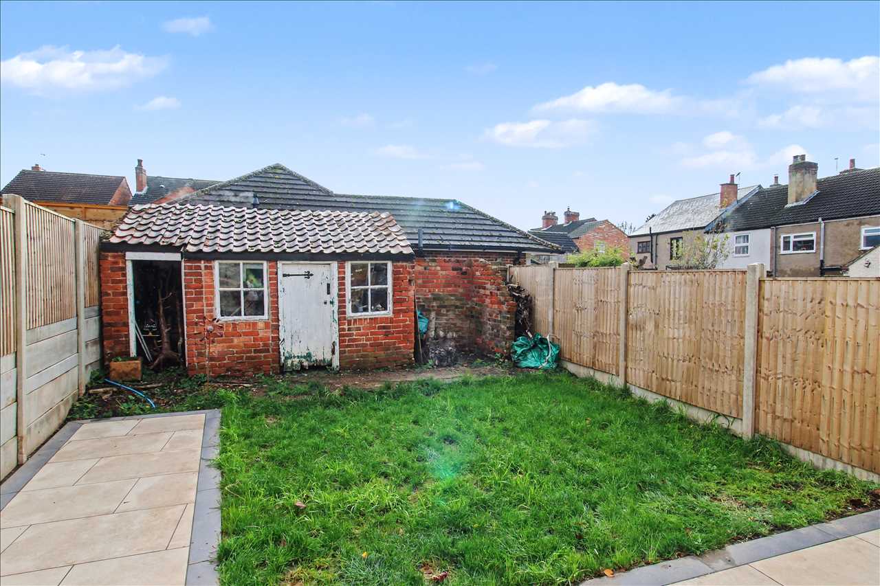 Enclosed garden to the rear of the property with patio area and garden area mainly laid to lawn, brick outbuildings and fenced borders.