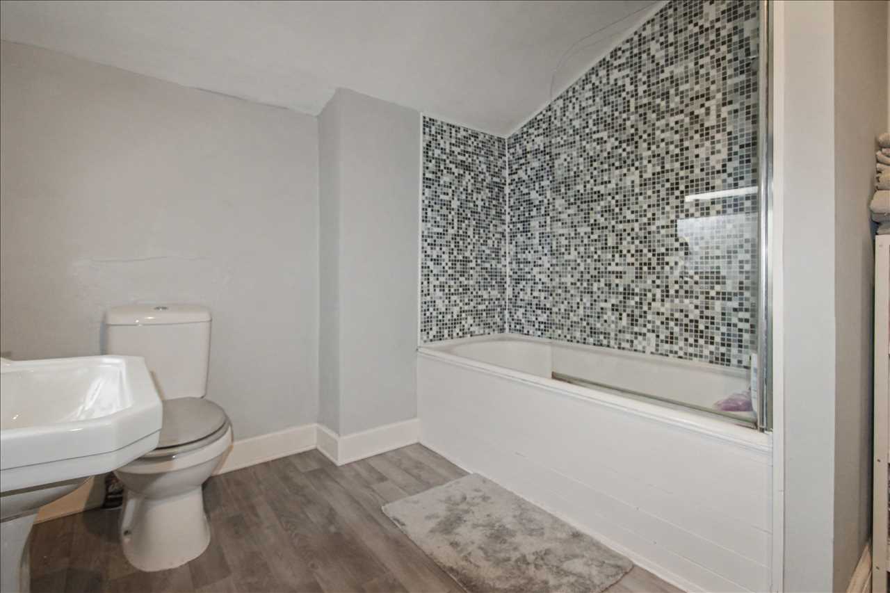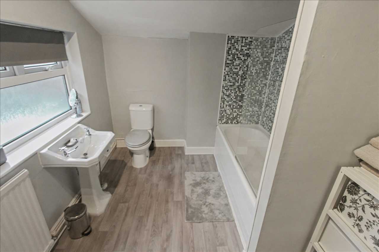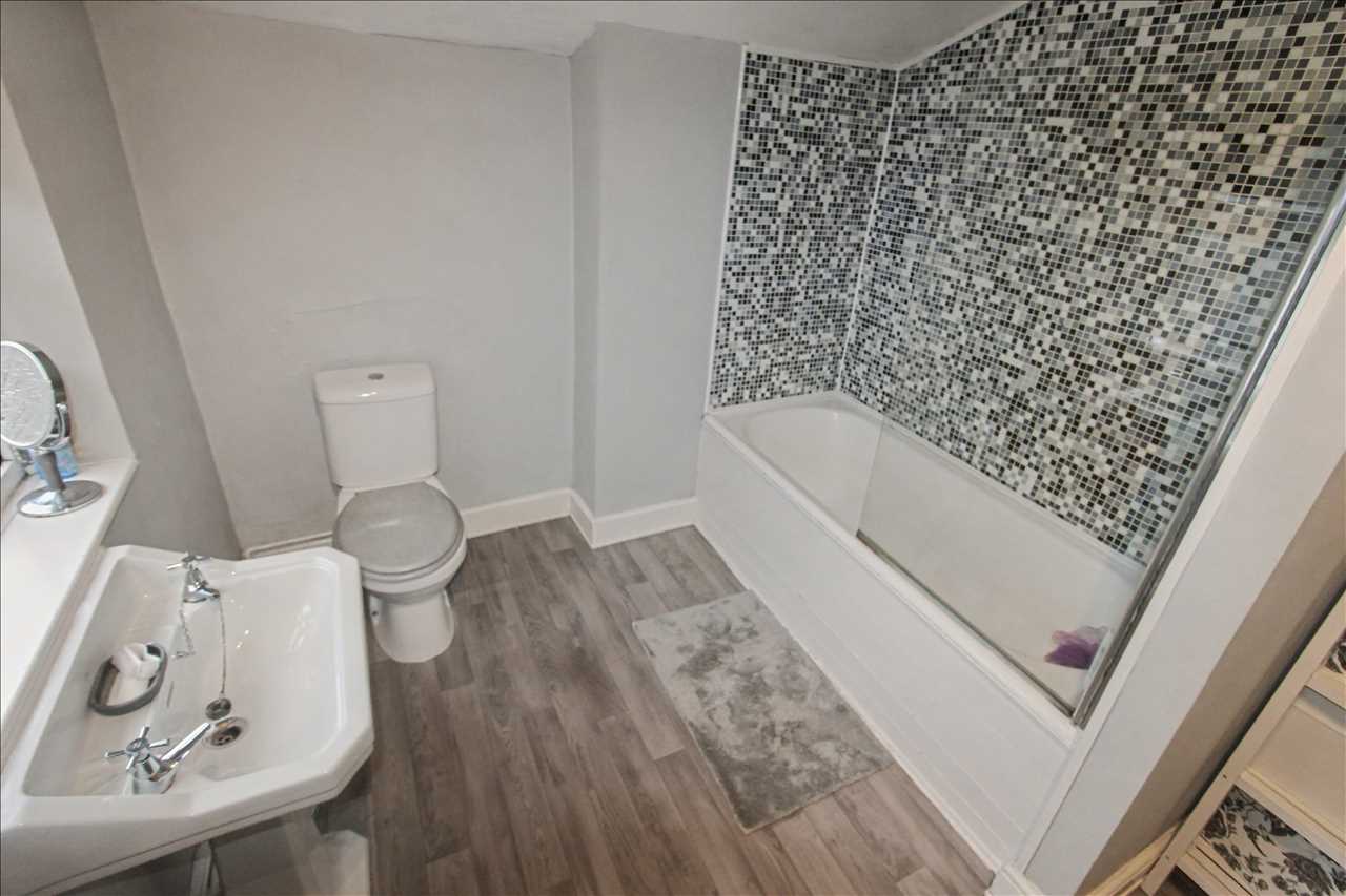 Frosted double glazed window to the side elevation, re fitted white suite comprising of panelled bath with shower over and shower screen, low flush wc and wash hand basin. Tiled splash back areas, airing cupboard housing combination boiler. Central heating radiator.