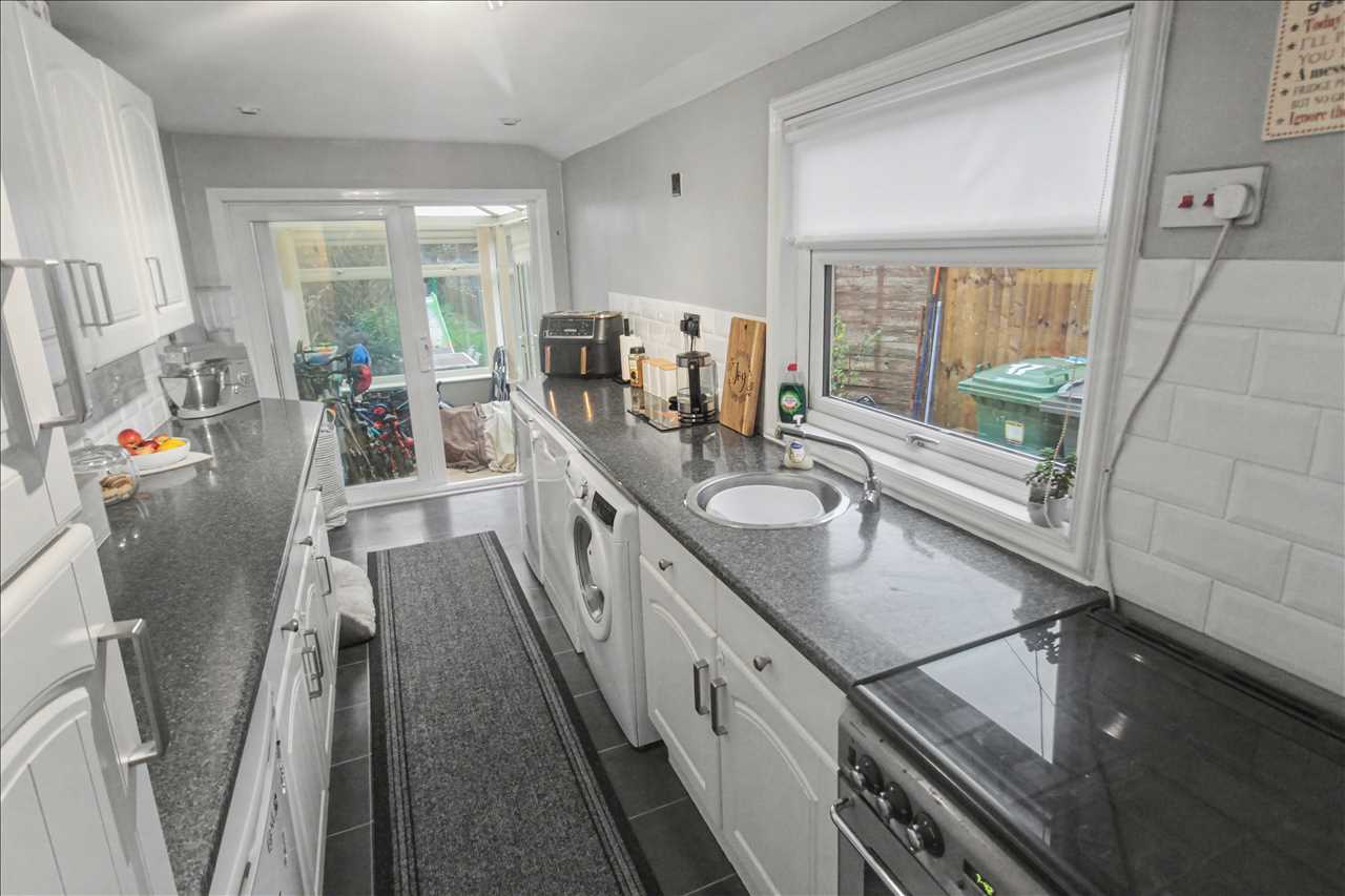 The kitchen comprises of stainless steel sink unit with mixer taps inset into roll edge work surfaces, a range of white base and wall units, space for cooker, plumbing for automatic washing machine, tiled splash back areas, tiling to the floor. Double glazed window to the side elevation, door giving access to the enclosed rear garden. Double glazed patio door leading to the conservatory.