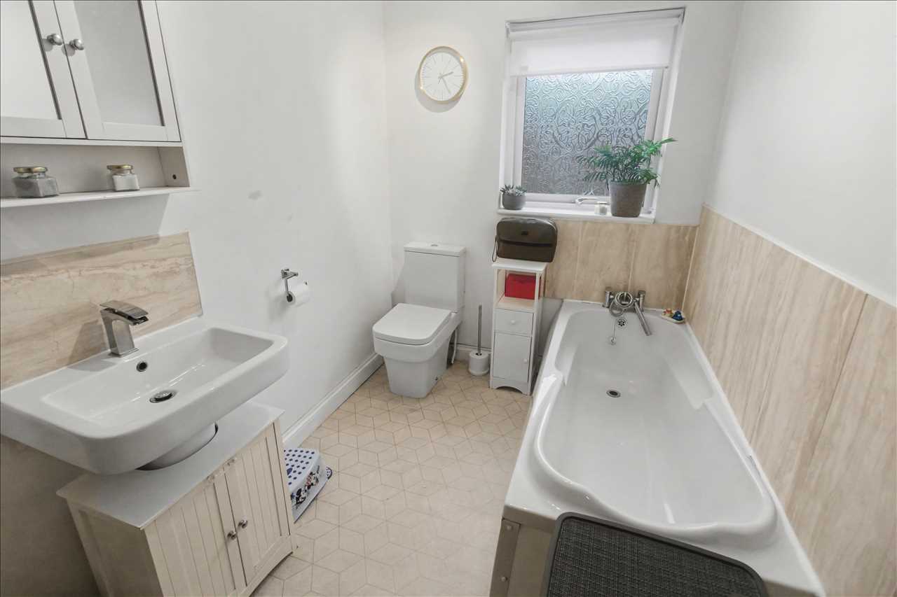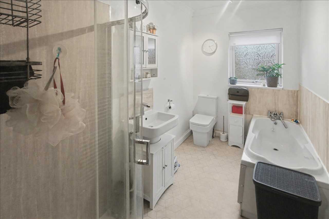 Re fitted white suite comprising of a panelled bath, pedestal wash hand basin, low flush wc and shower cubical with shower over. Heated towel rail.