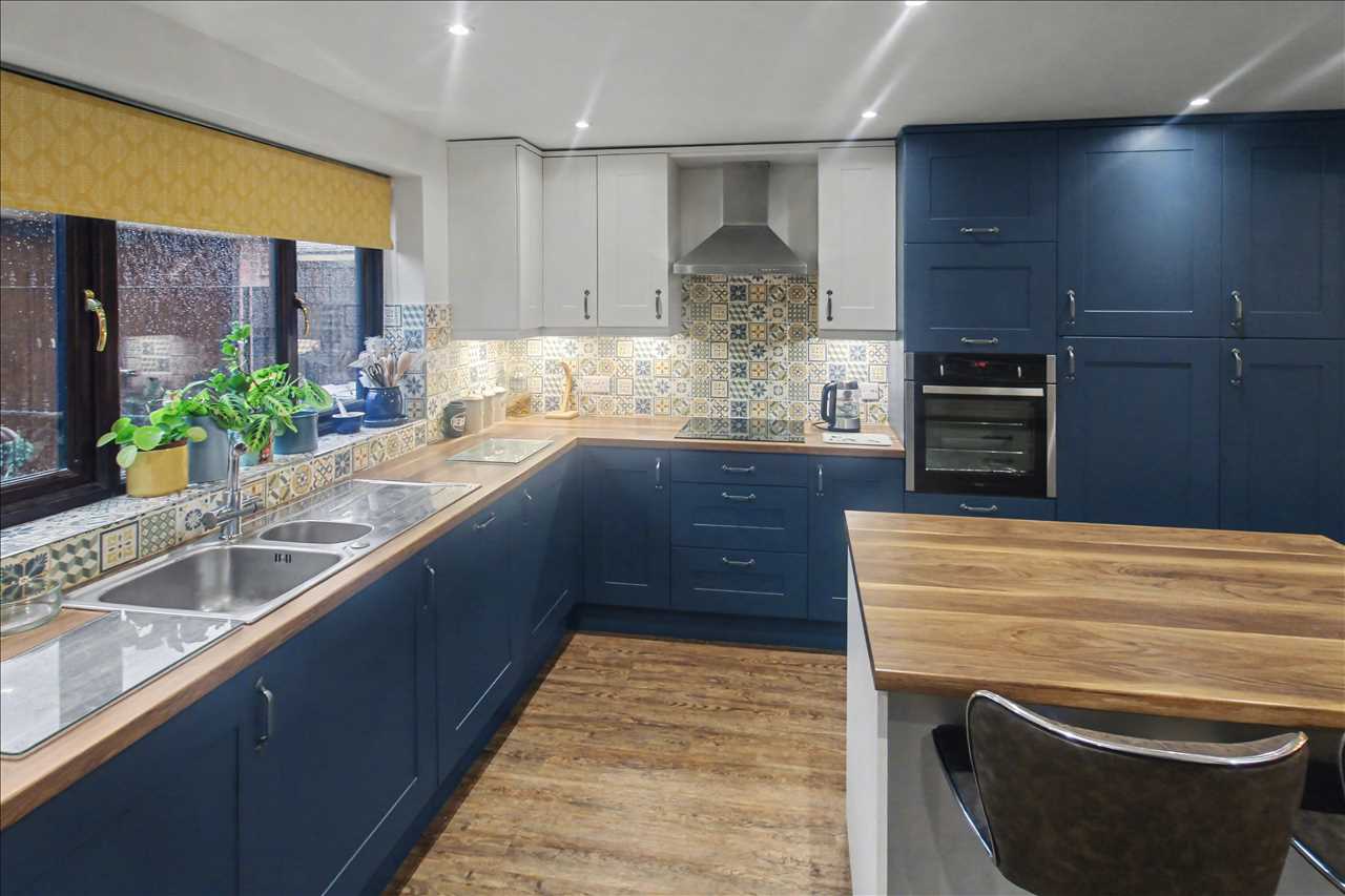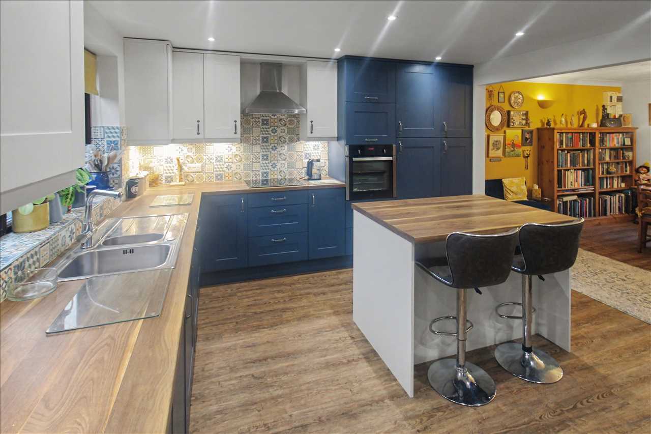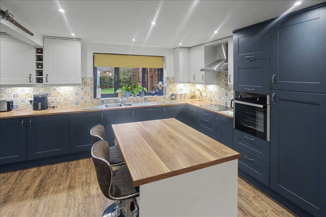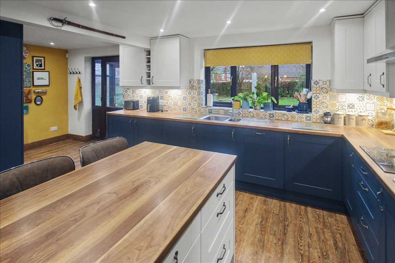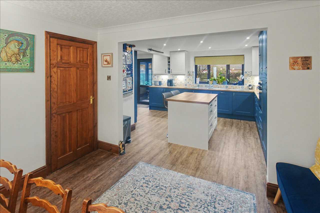 The redesigned open plan kitchen/dining room has the wow factor, the stunning kitchen comprises of a one and a half bowl sink unit in set into work surfaces, a range of base and wall units, island bar with draw units and seating area, built in oven, induction hob, extractor hood, built in fridge and freezer, built in dishwasher, spotlights to the ceiling and wood effect floor covering. Open plan access to the dining room and door leading to the conservatory porch.