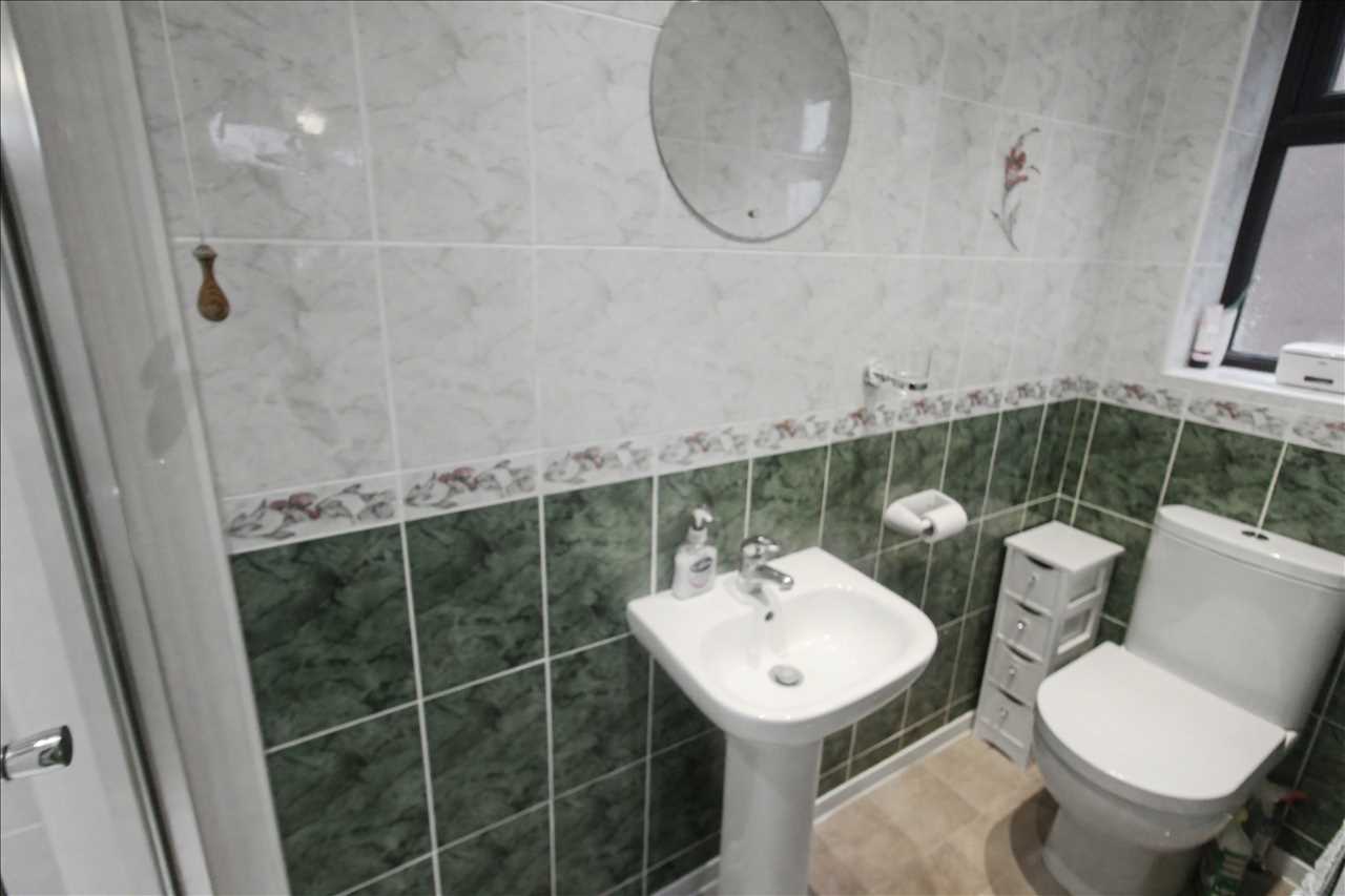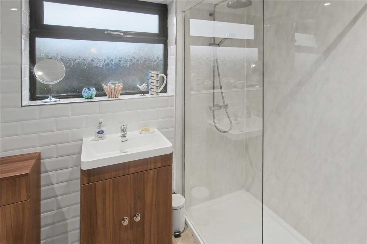 Frosted double glazed window to the rear elevation, the re fitted shower room comprises of a double walk in shower with rain fall shower over, wash hand basin with storage below and low flush wc, chrome heated towel rail, spotlights to the ceiling and tiling to the walls.