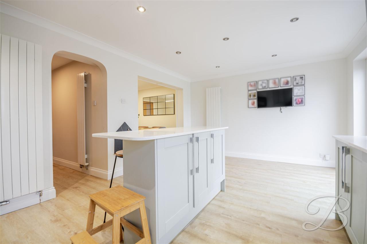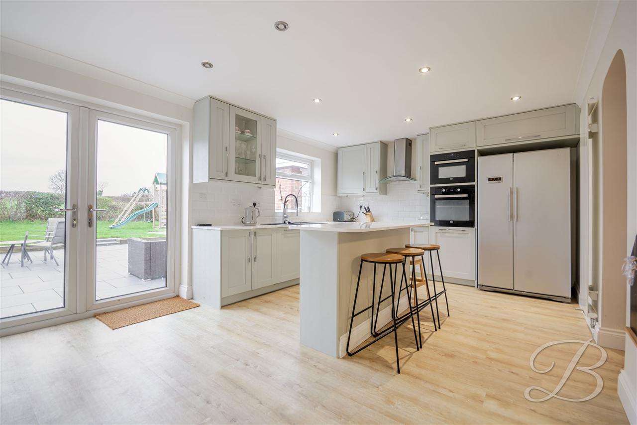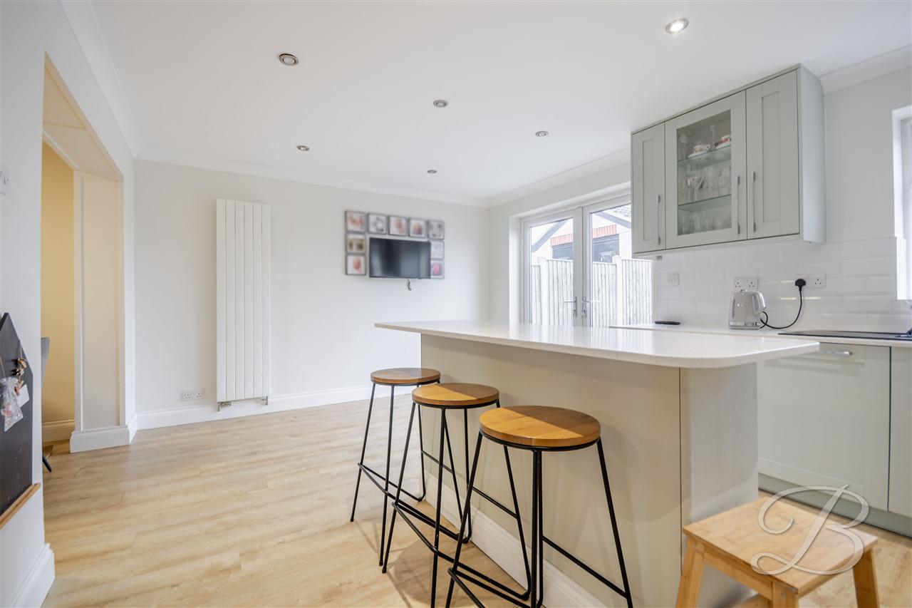 The extended modern fitted kitchen comprises a matching range of base and wall units with granite kitchen worktop, inset one and a half bowl single drainer sink unit, built in double electric oven, hob and extractor fan, integrated dish washer and fridge freezer, central island offering extra storage, laminate wood floor covering, vertical radiator, spotlights to ceiling, double glazed window to rear elevation and double glazed French doors leading out to the rear garden