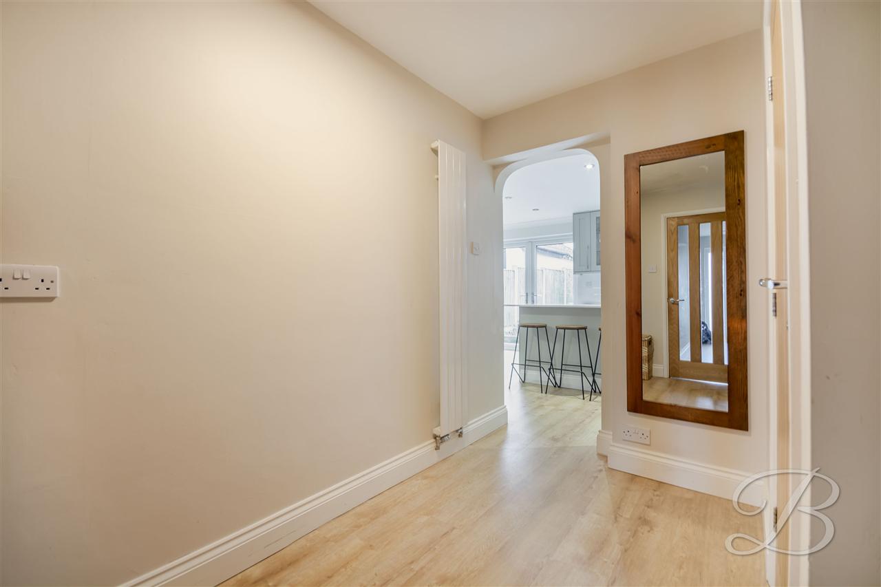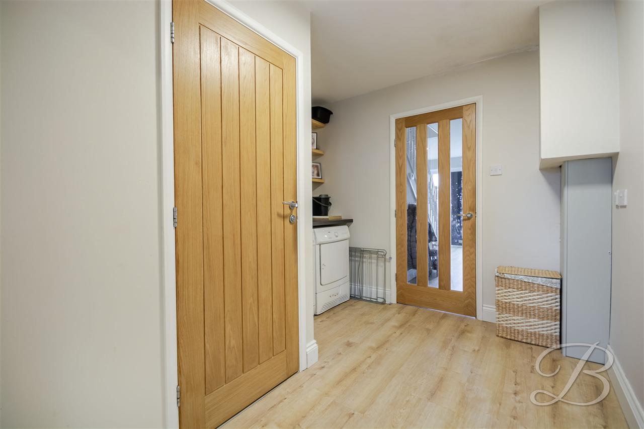 A light and welcoming entrance hallway having double glazed door to front elevation, laminated wood floor covering, modern vertical radiator spotlights to ceiling, useful understairs storage cupboard