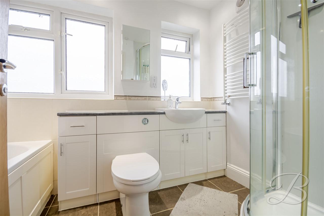 The spacious family bathroom has a four piece suite comprising panelled bath, separate shower cubicle, vanity wash hand basin with storage under and low flush wc. There is an obscure double glazed window to the rear elevation and heated towel rail