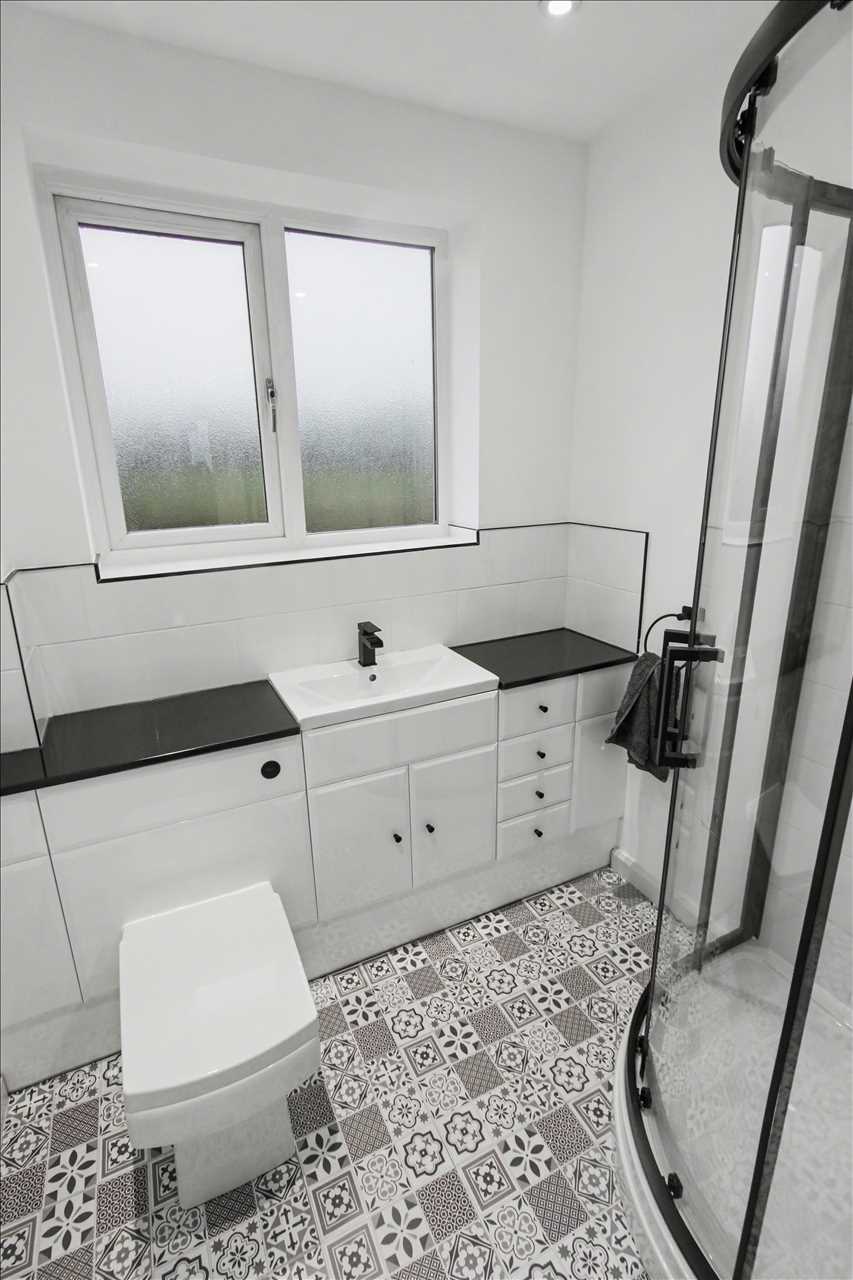 Re fitted shower room comprising of a walk in shower with shower over, low flush and pedestal wash hand basin with storage cupboards below. Tiled splash back areas and central heating radiator.