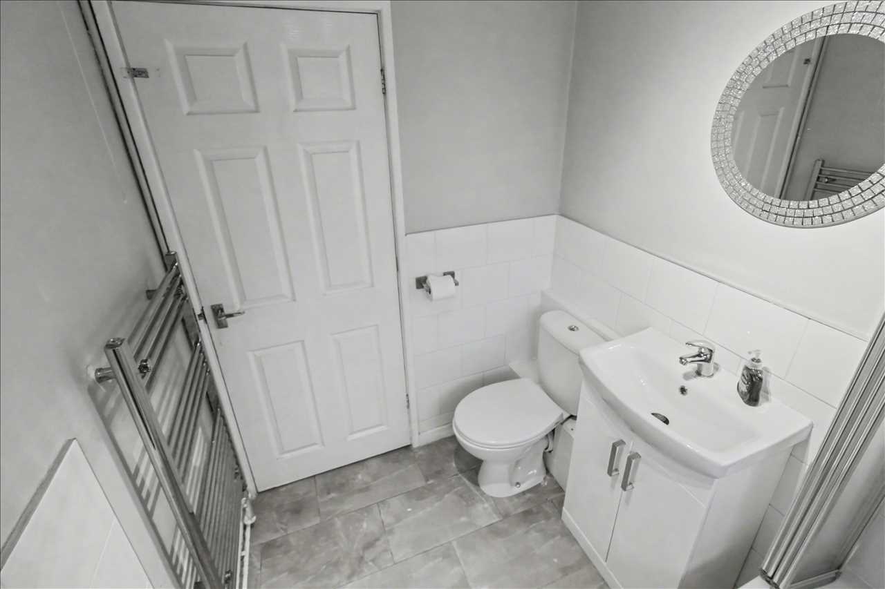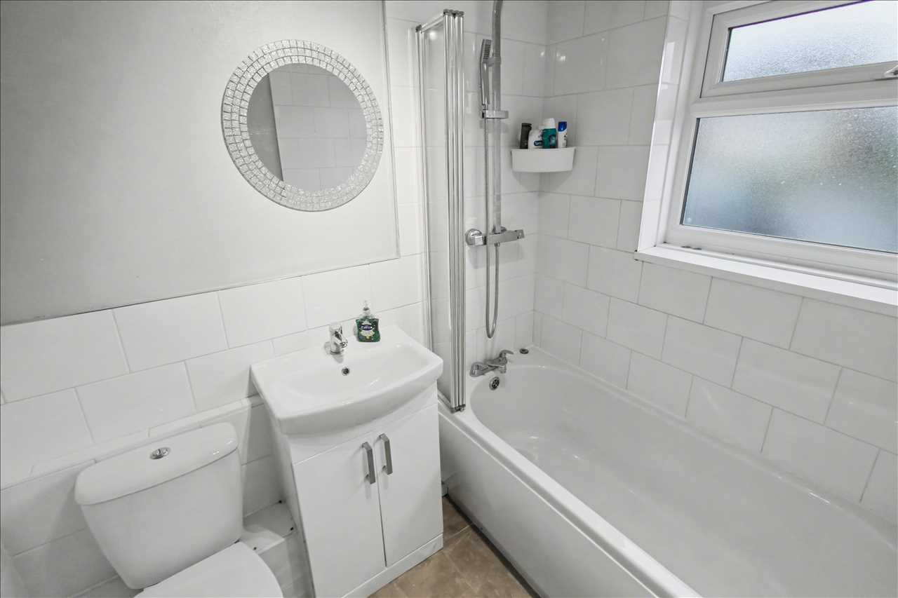 Frosted double glazed window to the front elevation, white suite comprising of panelled bath with shower over, pedestal wash hand basin with storage below and low flush wc. Chrome heated towel rail.