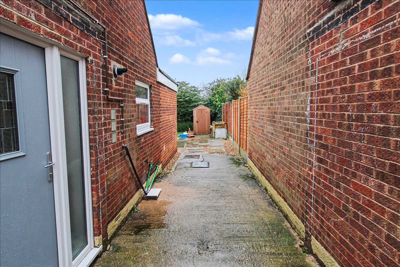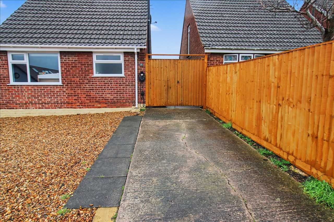 Driveway to the front with boundary fence to the right of the property. Double wooden gates leading to the further driveway which leads to the enclosed rear garden. Cold water tap to the side.