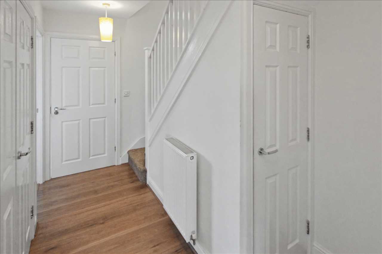 Access to the open plan lounge/kitchen/diner, bedroom two and bathroom. Staircase to the first floor. Storage cupboards one having plumbing for automatic washing machine. Central heating radiator. Laminate floor covering.