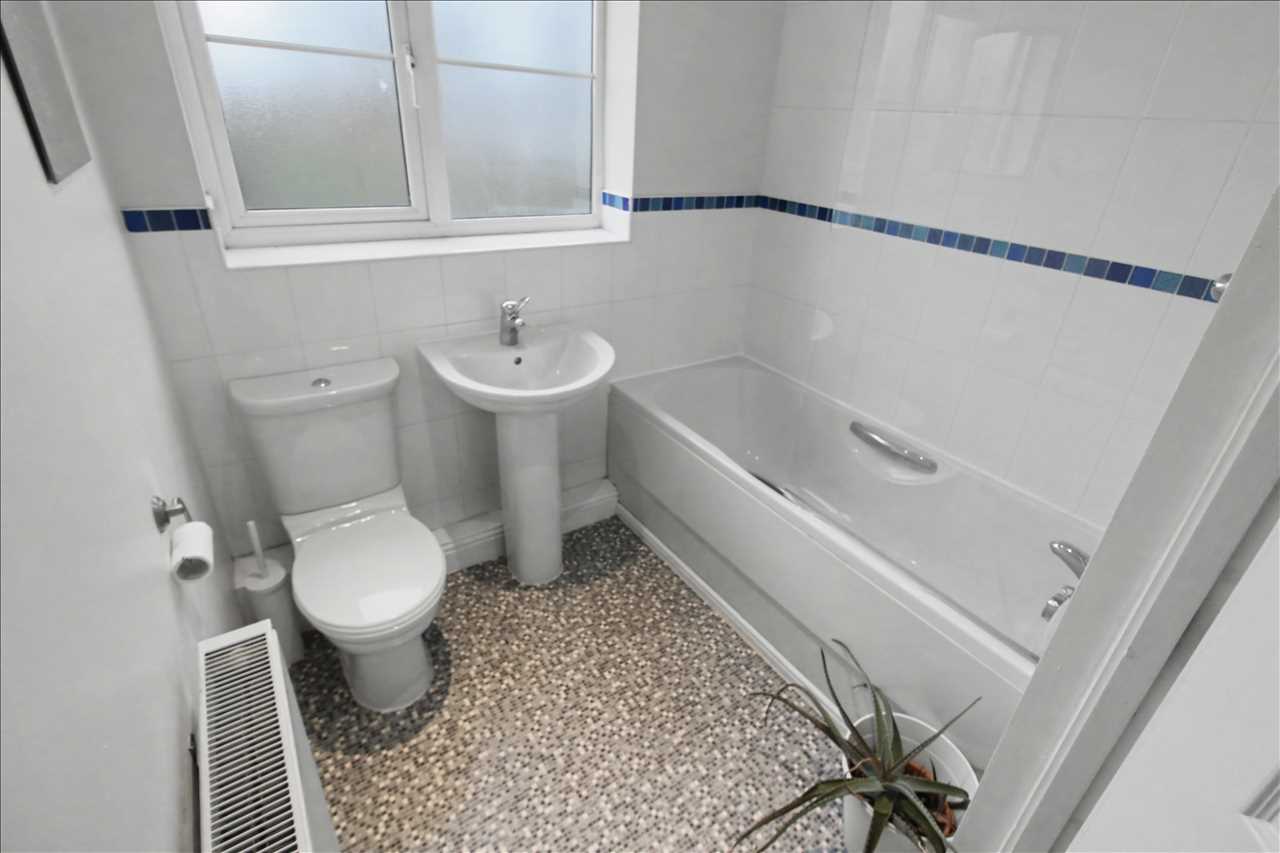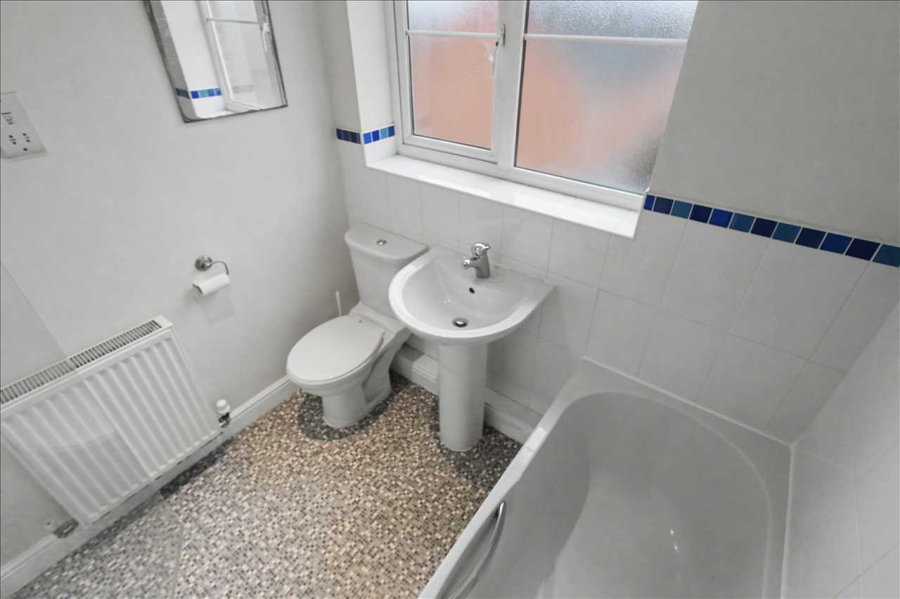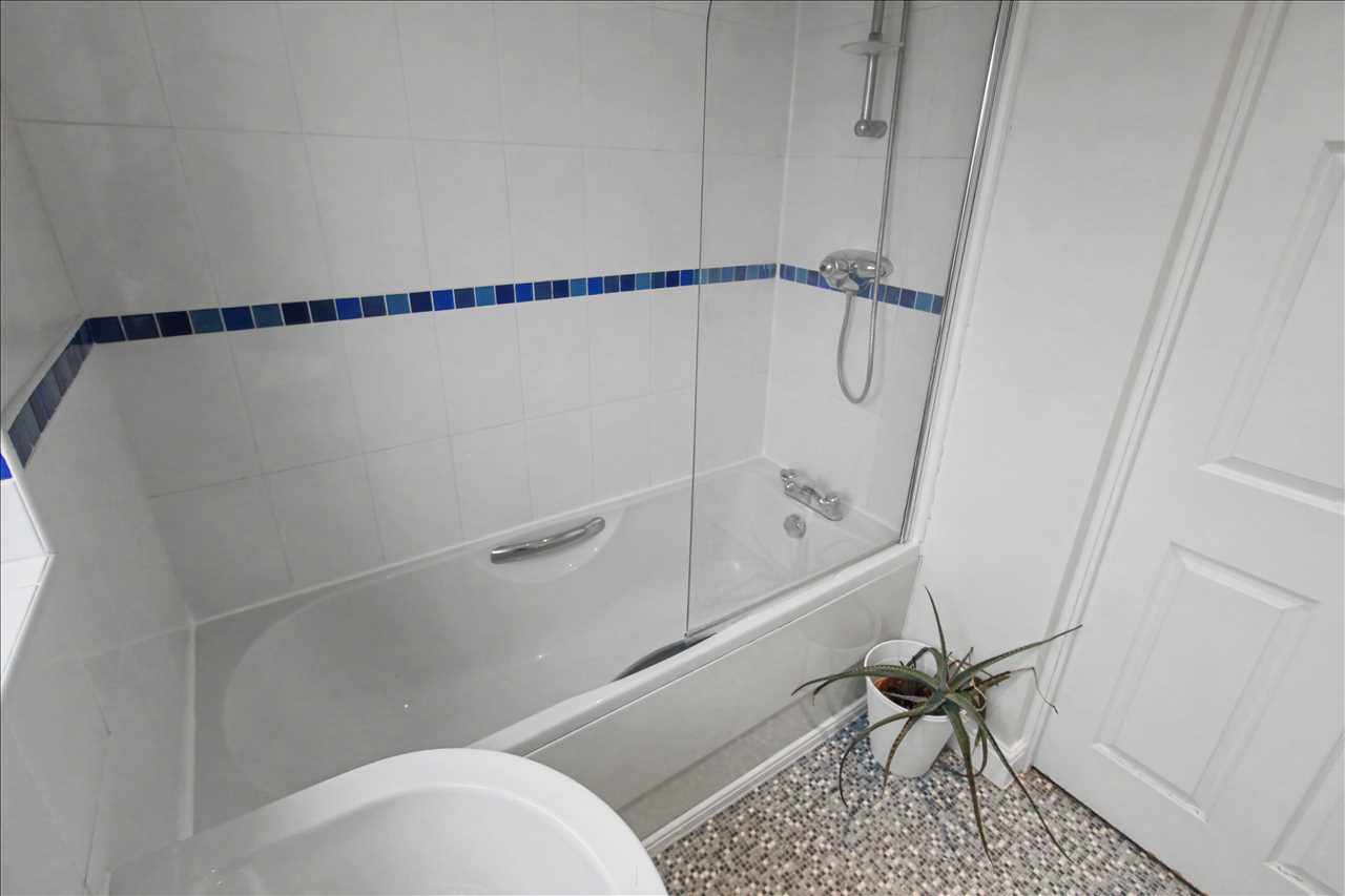 White suite comprising of panelled bath with shower over, pedestal wash hand basin and low flush wc. Tiling to the walls and central heating radiator.