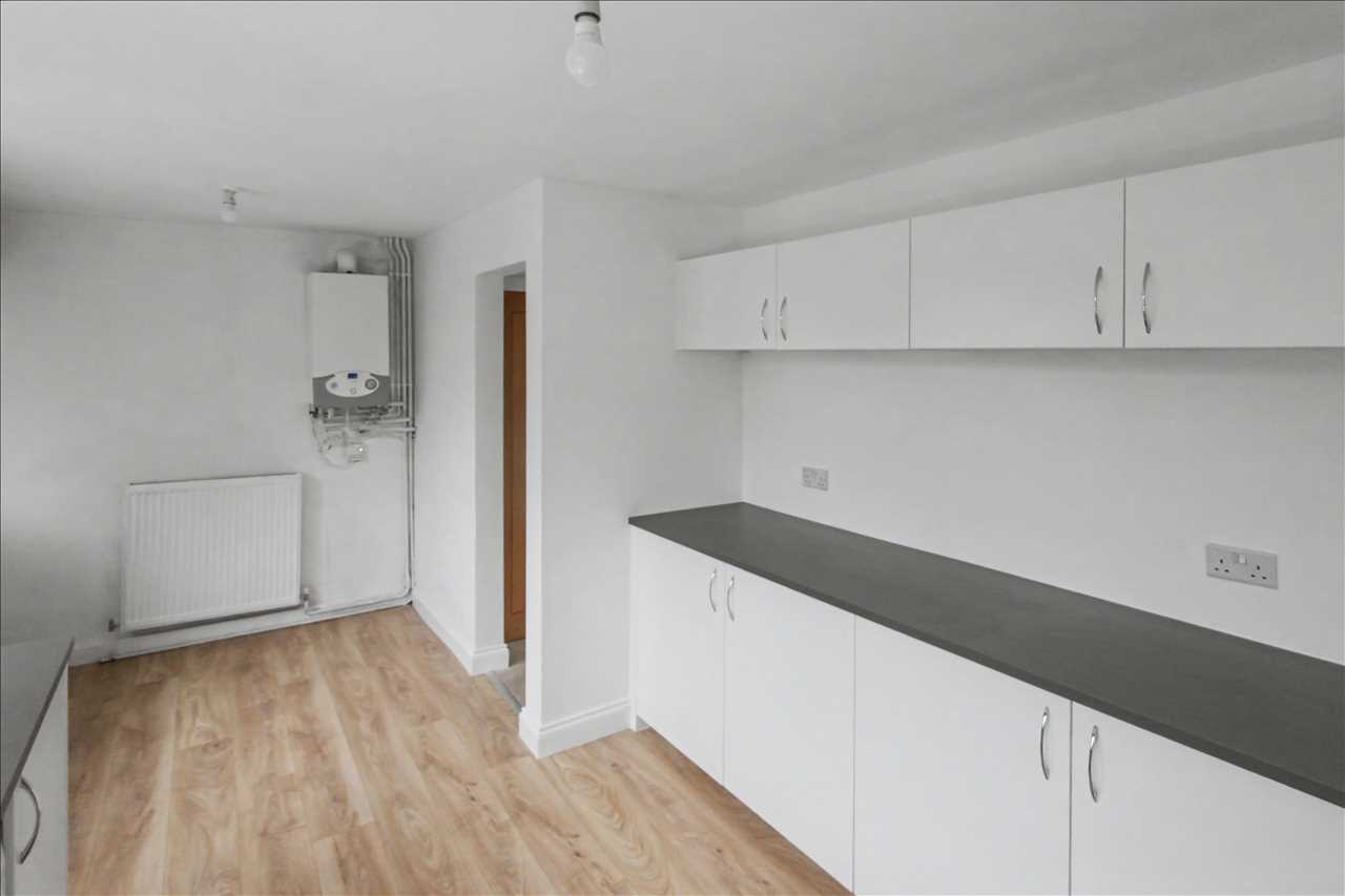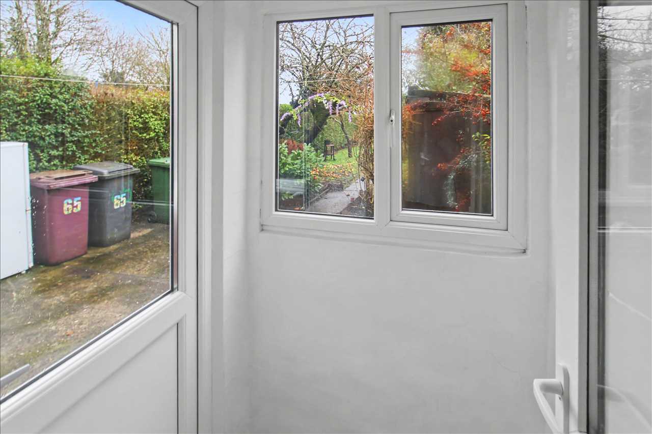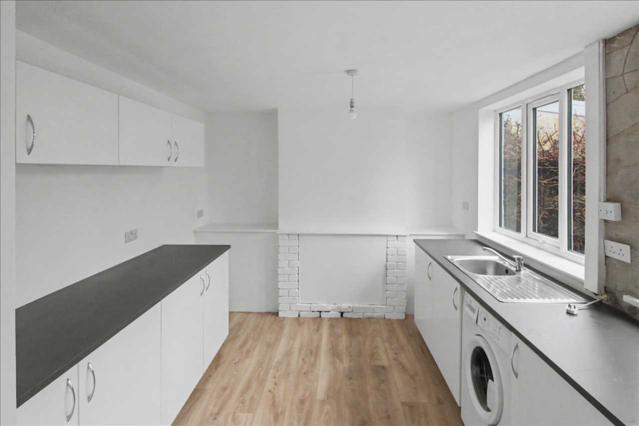 Double glazed window over looking the rear garden, stainless steel sink unit with mixer taps and side drainer inset into work surfaces, a range of white base and wall units, Plumbing for automatic washing machine. Central heating radiator. Door leading to the rear porch.
