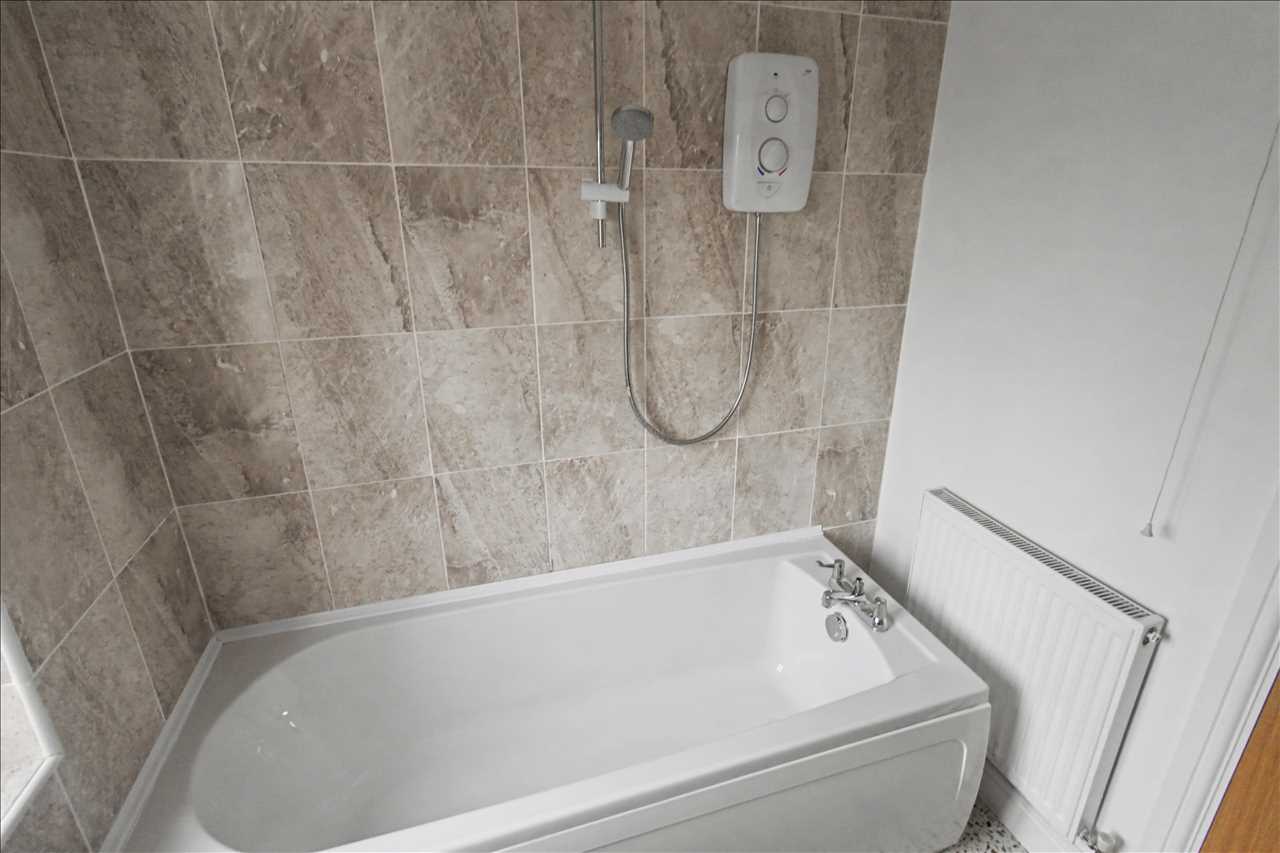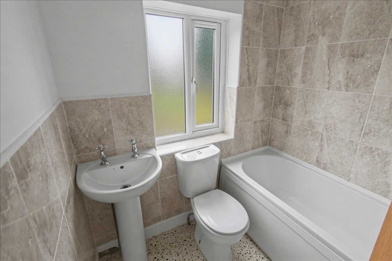Frosted double glazed window to the rear, white three piece suite comprising of panelled bath with shower over, pedestal wash hand basin and low flush wc. Central heating radiator. Tiling to the walls.