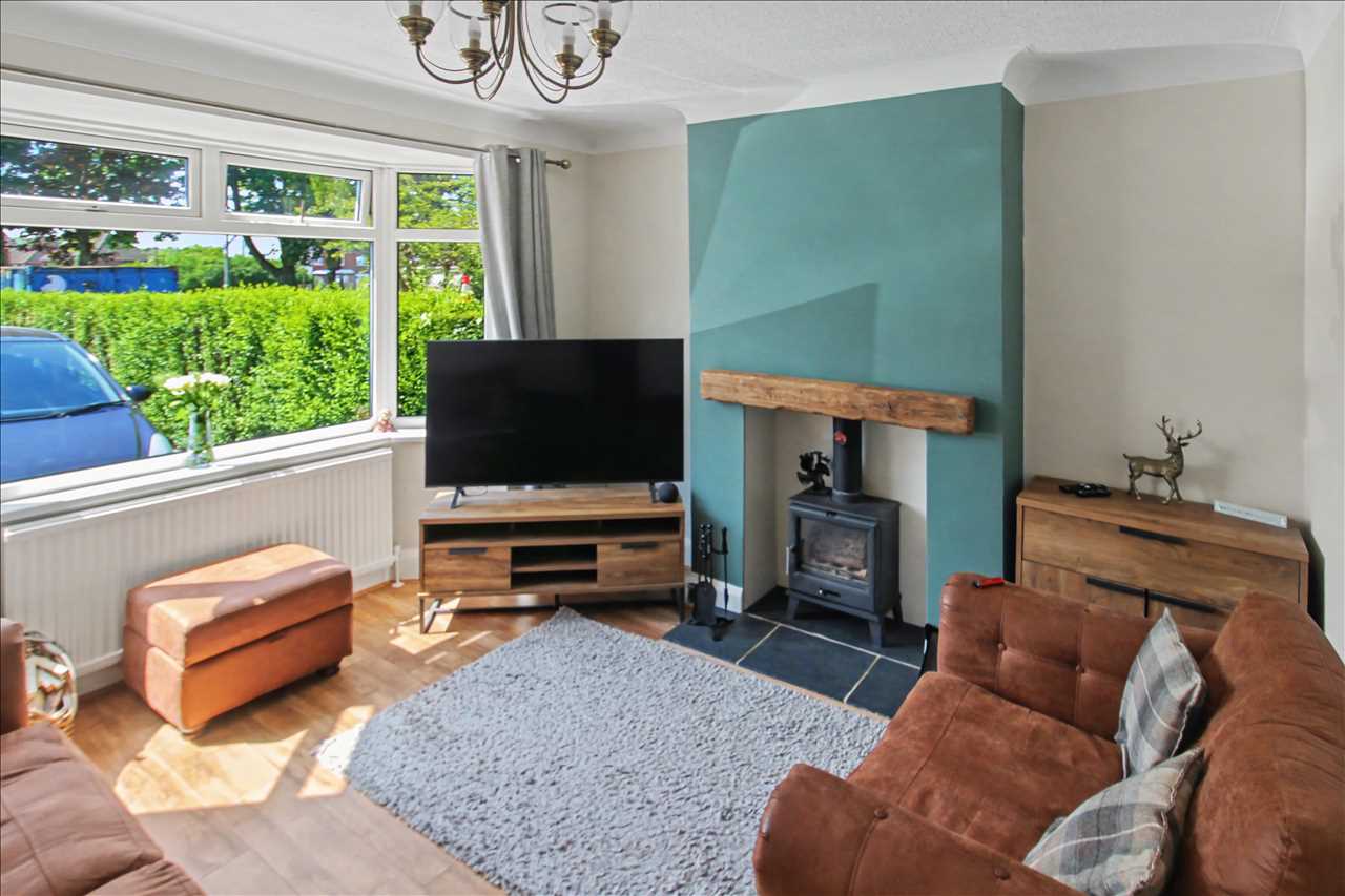 With double glazed walk in bay window to the front elevation, feature fire surround with inset log burner, laminate wood floor covering, coving to ceiling and radiator