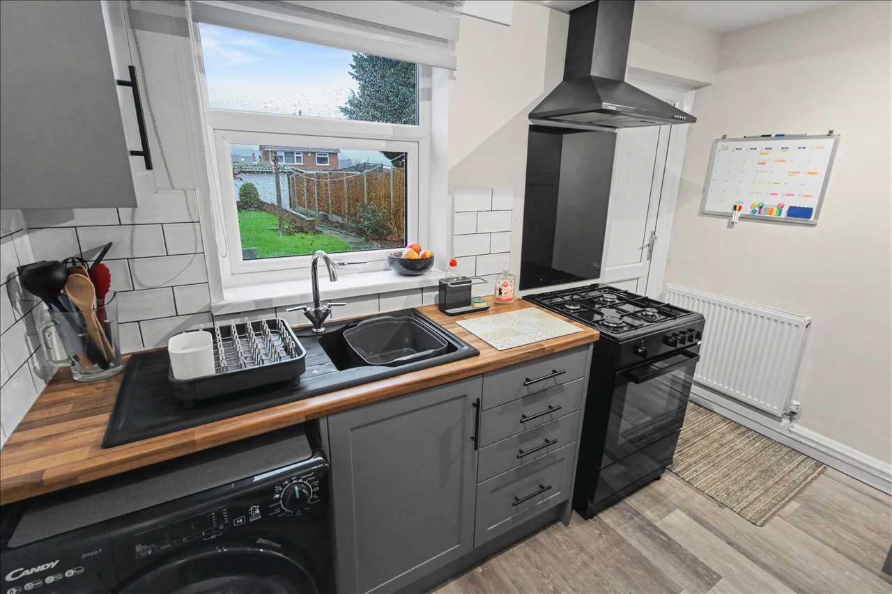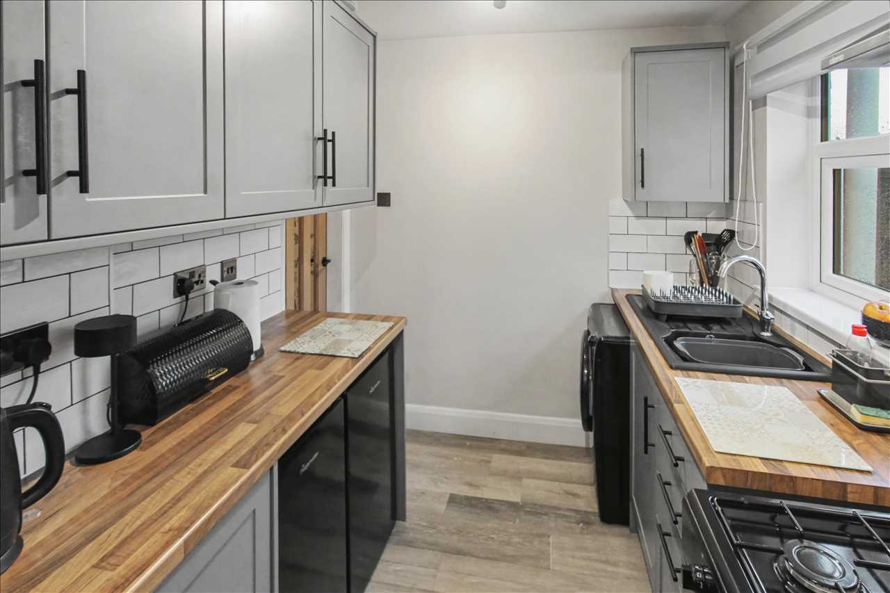 A stunning re fitted kitchen with a double glazed window over looking the enclosed large rear garden and a door giving access to the garden. The kitchen comprises of sink unit with mixer taps and side drainer inset into work surfaces, a range of base and wall units with cooker space and extractor hood over. Plumbing for automatic washing machine. Tiled splash back areas.