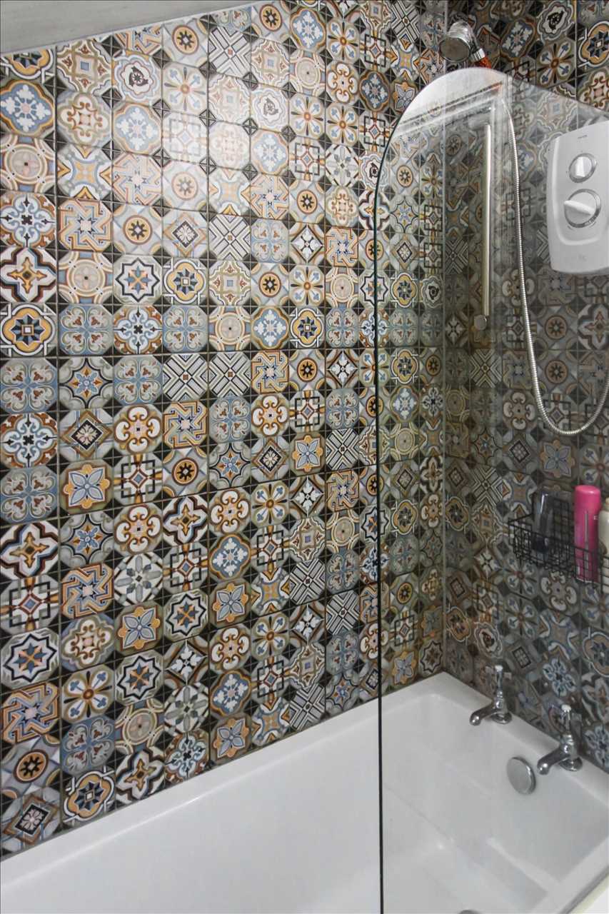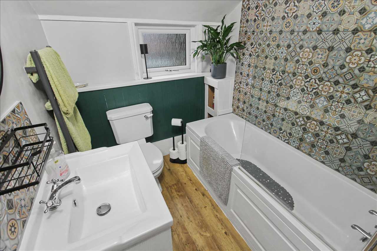 Re fitted white bathroom suite comprising of a panelled bath with shower over, wash hand basin and low flush wc. Tiling to the walls.