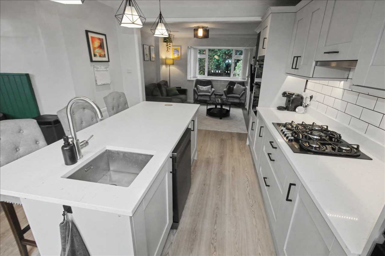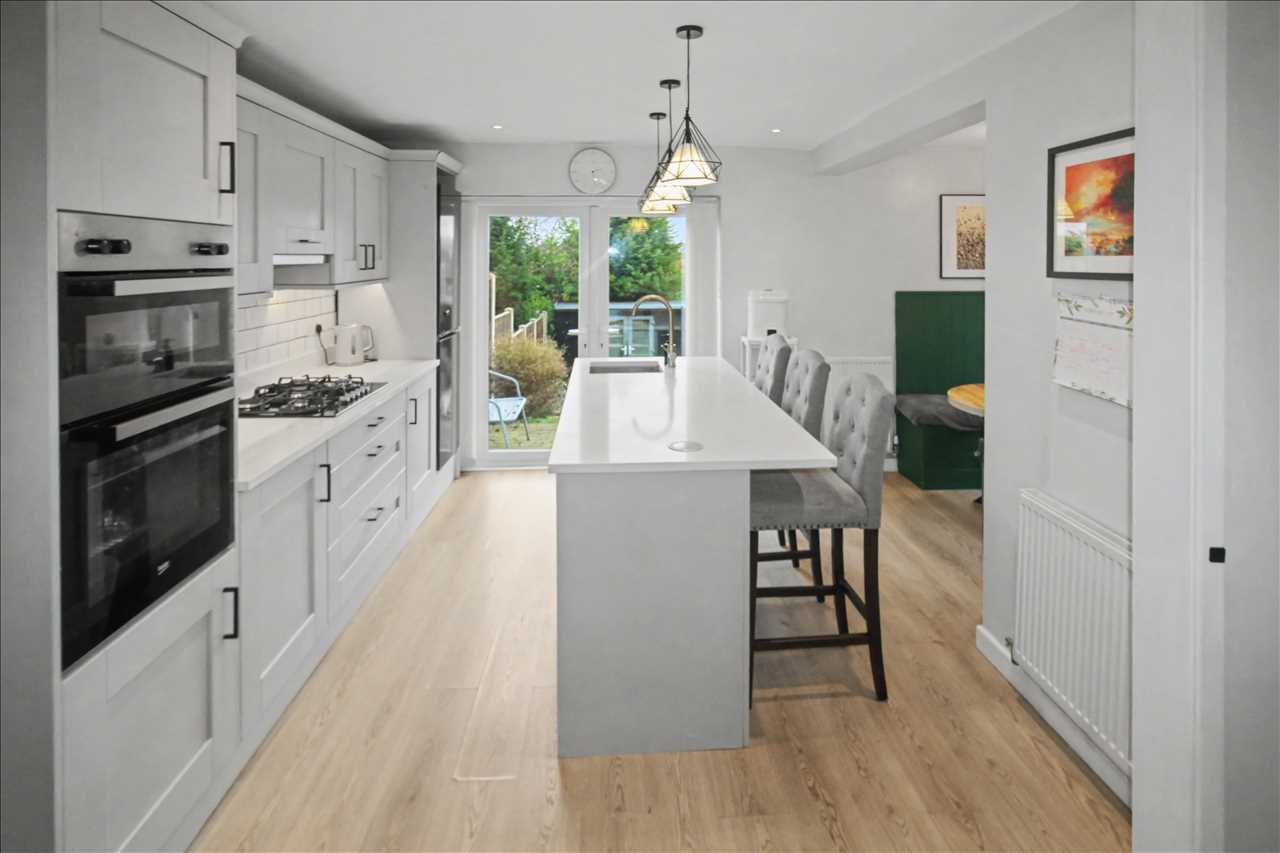 The extremely well presented kitchen has a range of matching base and wall units with worktops over, built in double electric oven, five burner gas hob with extractor hub over, central island with inset sink, space for fridge freezer, laminate wood floor covering, French doors leading out to the rear garden, open plan ot the dining/snug area