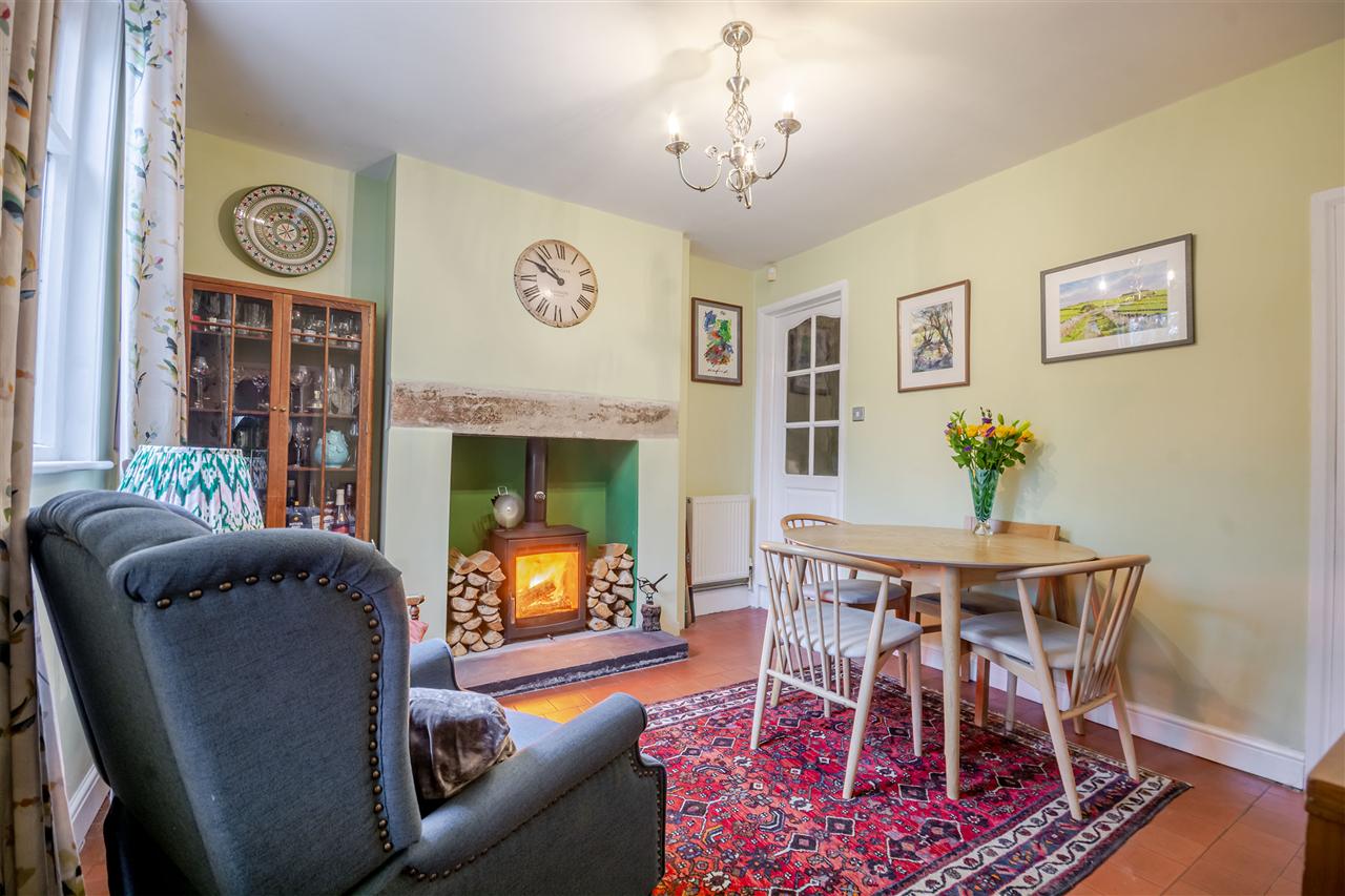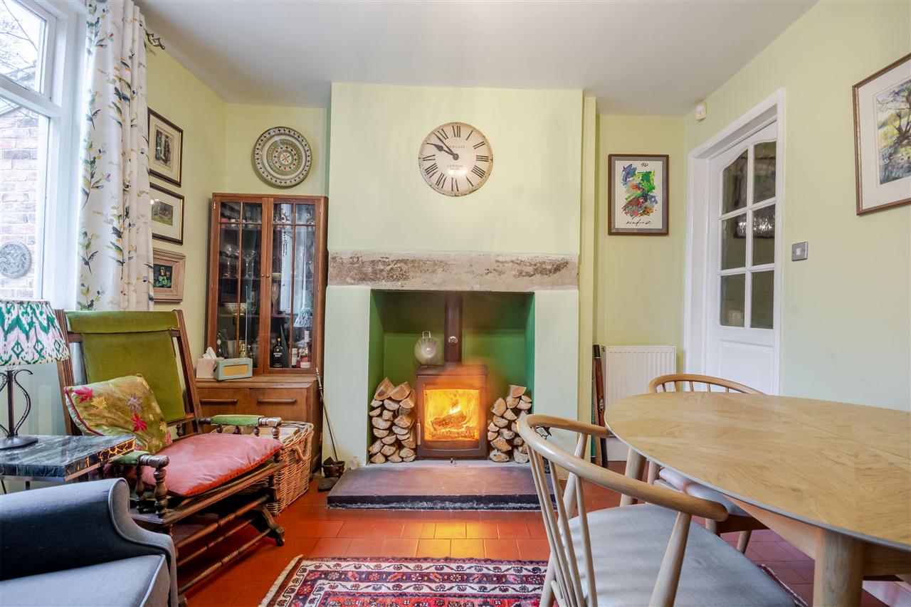 The dining room/second reception room has a feature fire surround with inset log burner, quarry tiled flooring, radiator, double glazed window and doors leading into the beautifully designed kitchen, useful pantry/larder and stairs leading off to the first floor accommodation