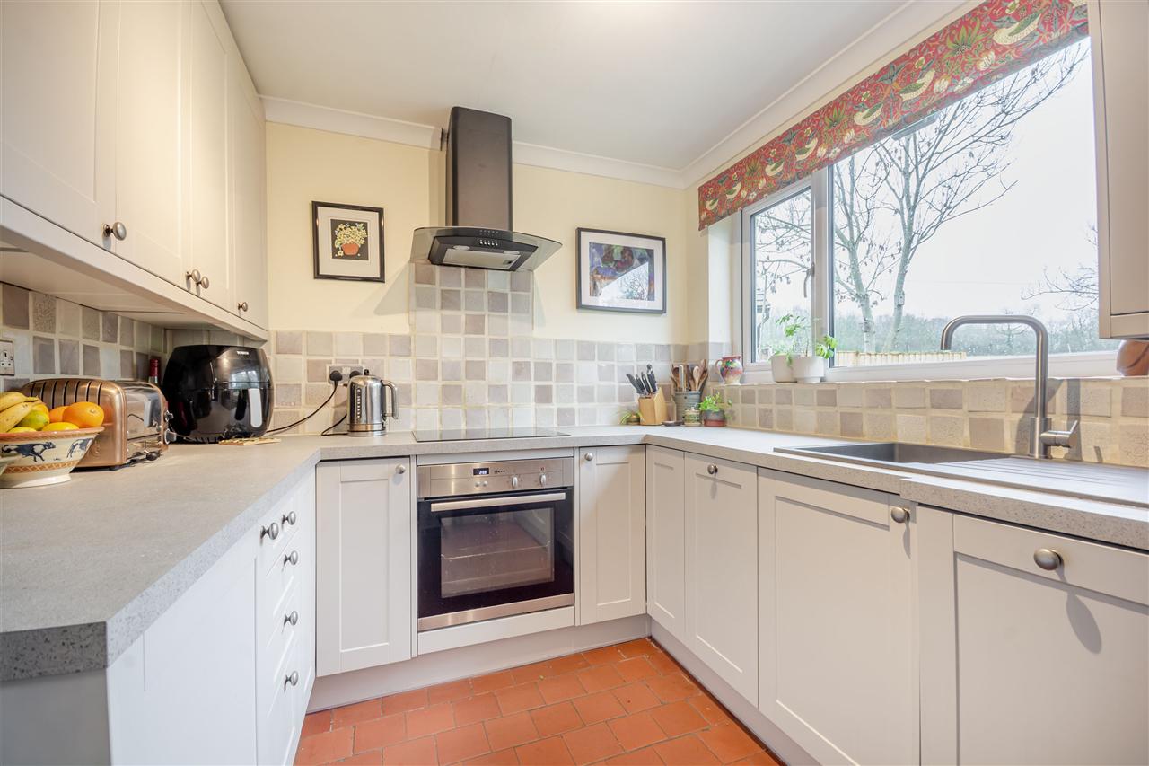 The shaker style Wren kitchen has a been recently refitted and comprises a range of matching and base wall units with works surfaces over, inset single drainer sink unit, built in oven, hob and extractor, integrated dishwasher, washing machine and bin unit, quarry tiled flooring and doors leading back into the dining room and to the garden