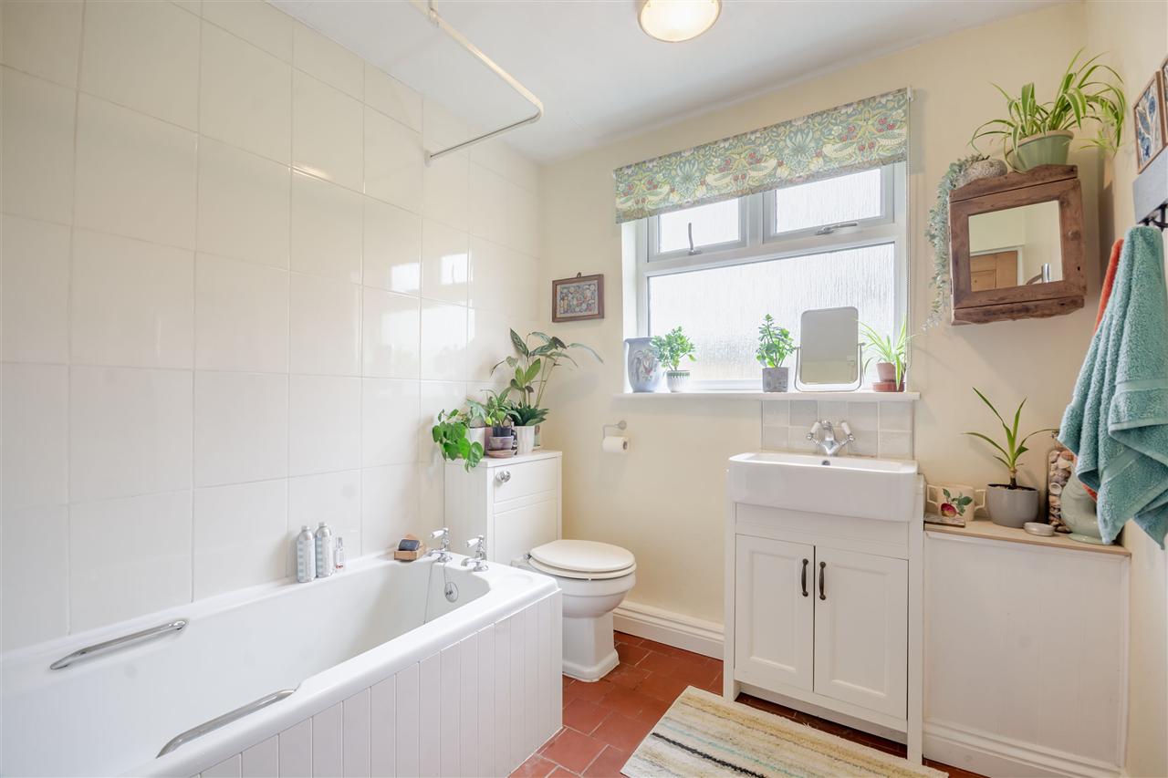 The spacious bathroom has a white suite comprising of panelled bath, wash hand basin with vanity storage under, low flush wc, tiled walls, radiator and obscure double glazed window