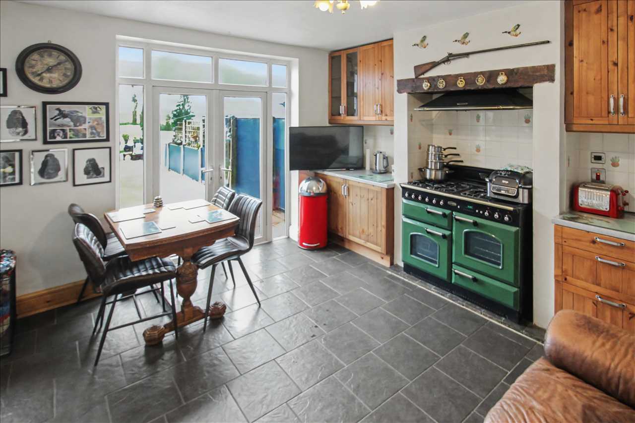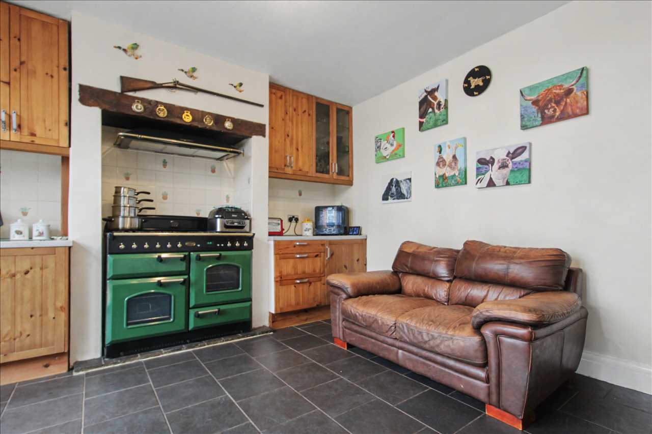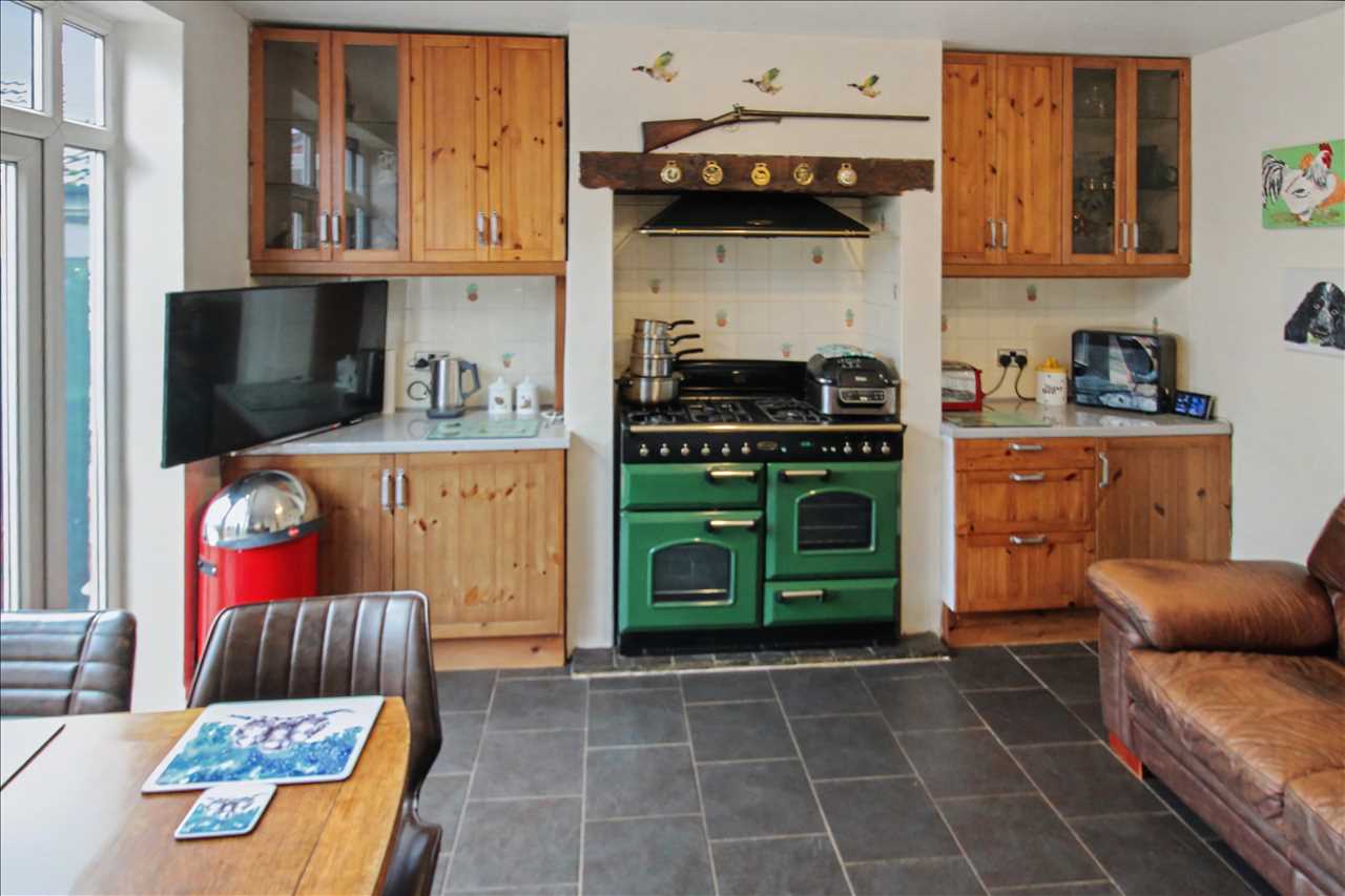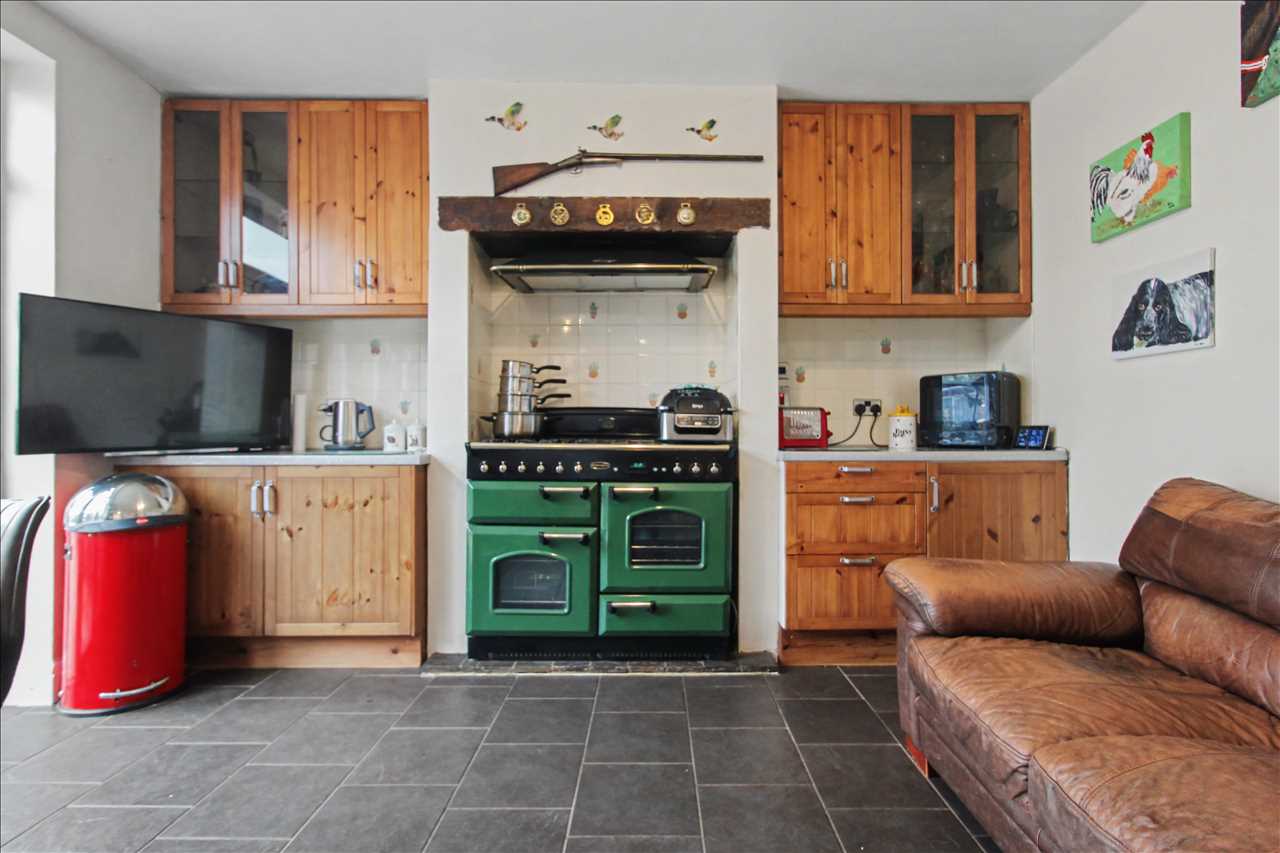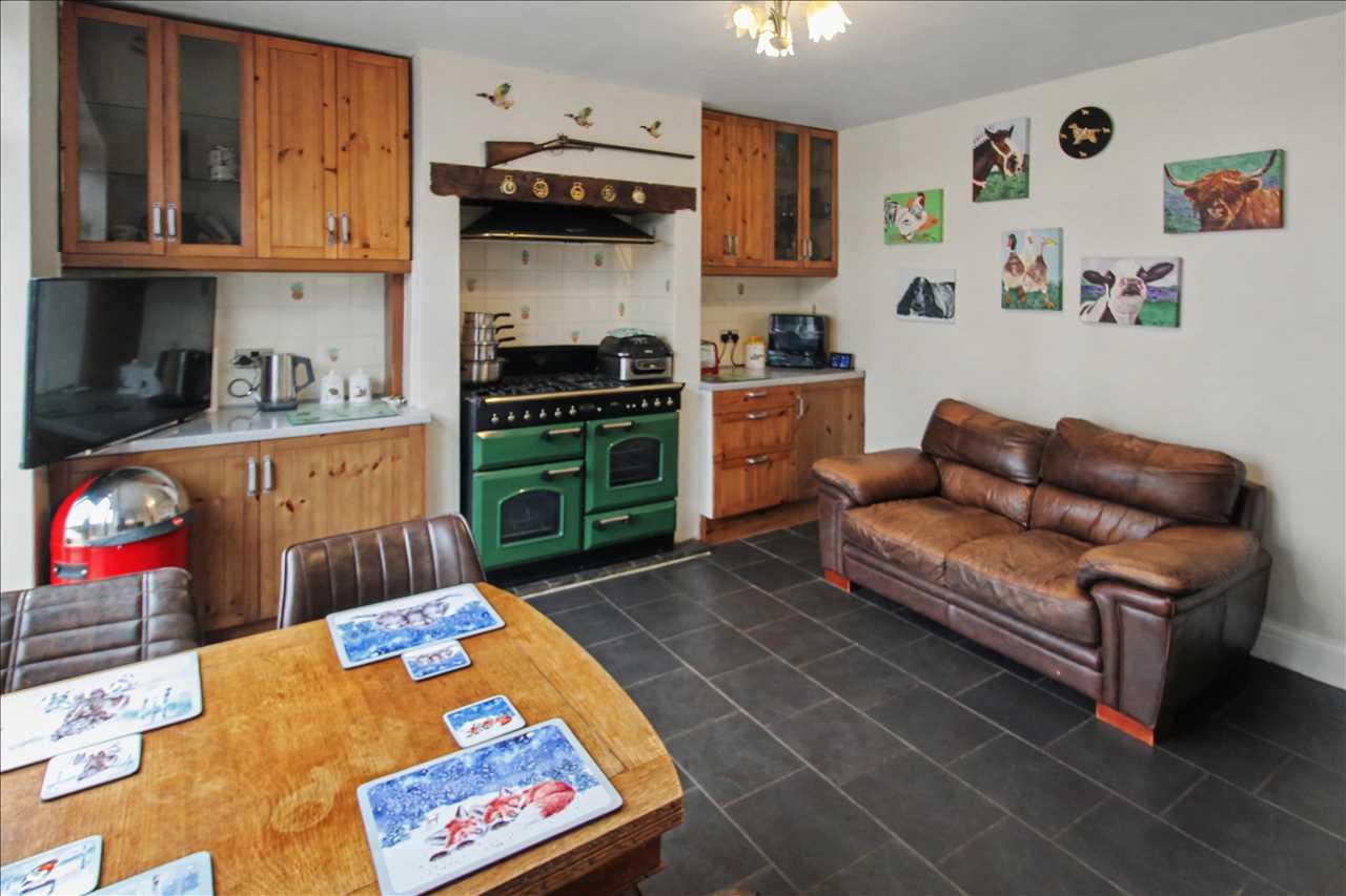The open plan kitchen diner has a range of base and wall units with work surfaces over, Belfast sink unit, Aga style range cooker with extractor hood over, space for fridge freezer, tiled flooring, radiator, double glazed windows to rear elevation, double glazed French doors leading out to the rear garden
