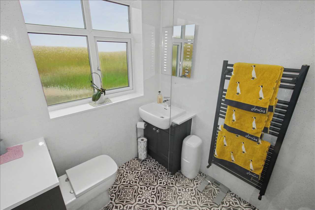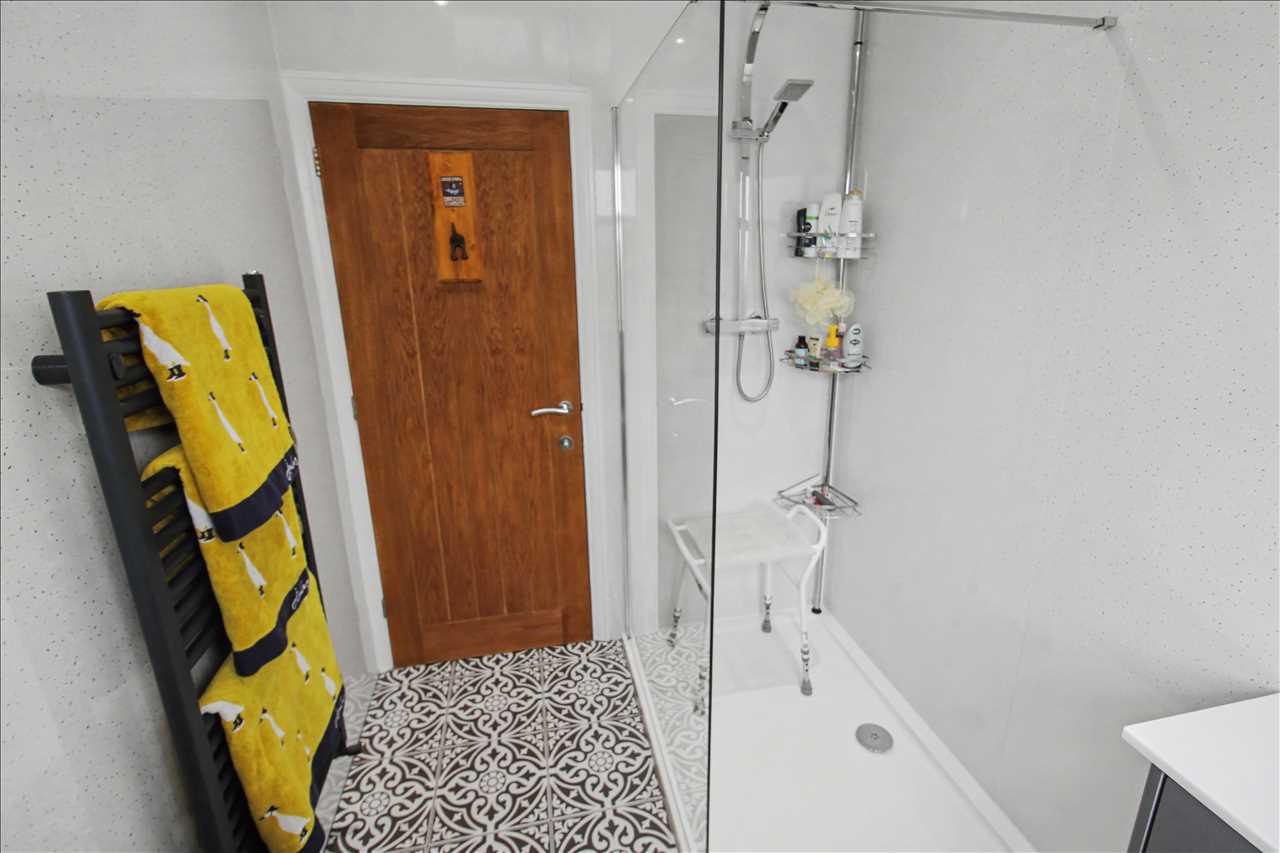 The bathroom comprises a white suite of double walk in shower with glass shower screen, wash hand basin with storage unit under, low flush wc, heated towel rail, Mermaid boarding to walls, tiled floor and obscure double glazed window to front elevation