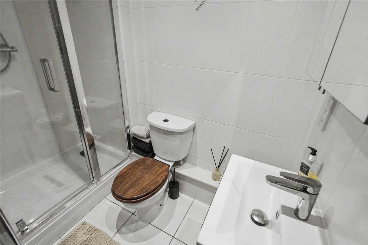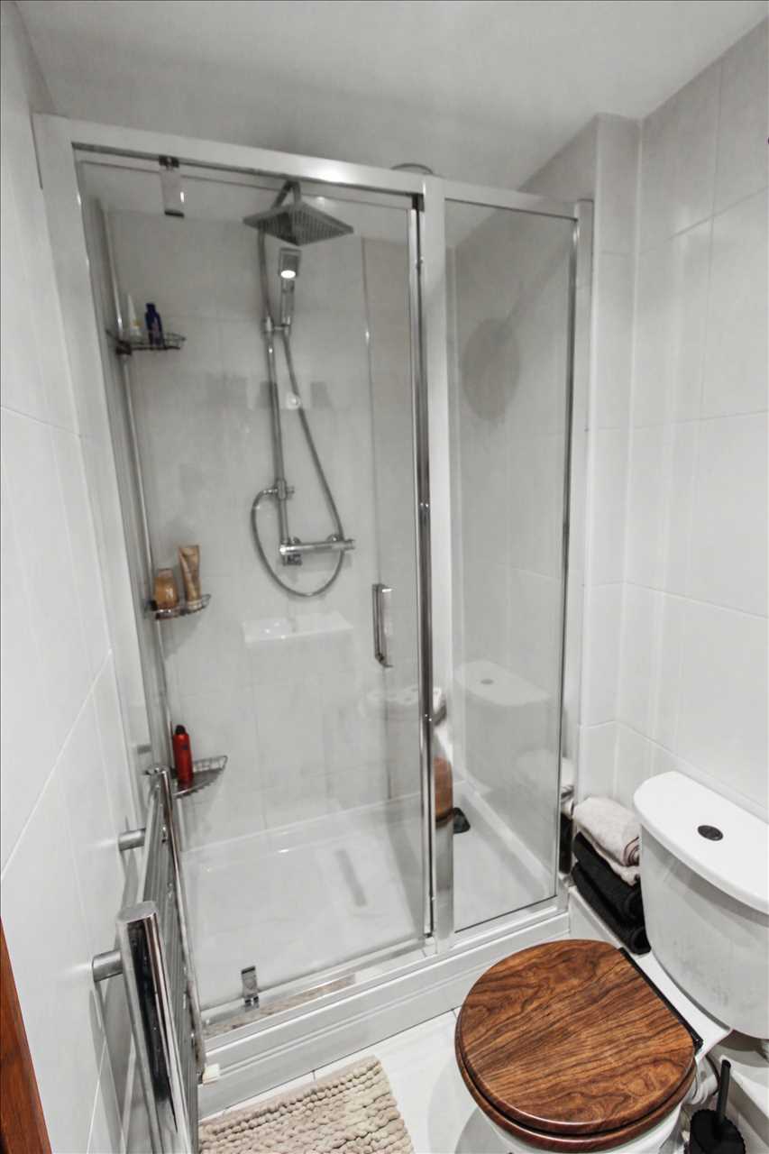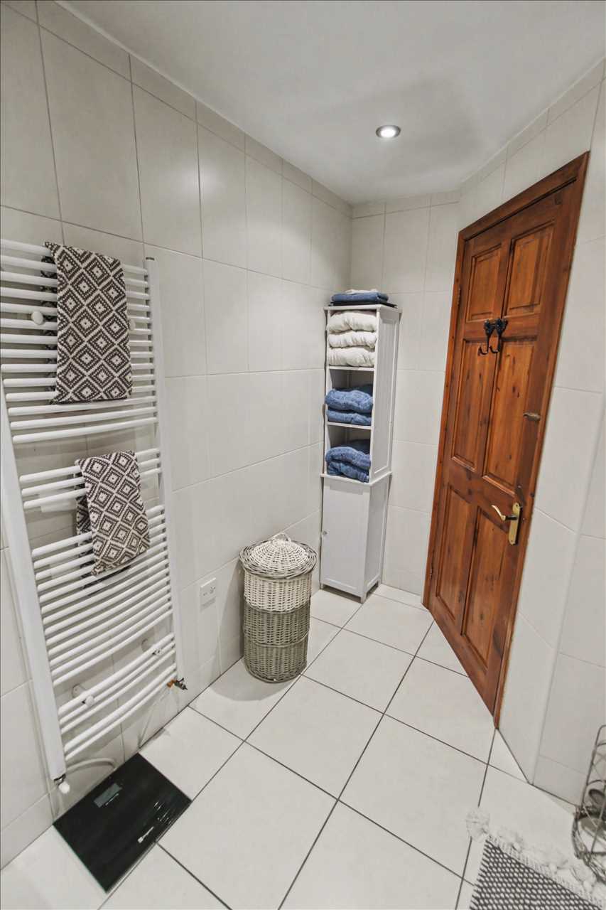 White suite comprising of walk in shower cubical, low flush wc and wash hand basin. Chrome heated towel rail. Under floor heating.