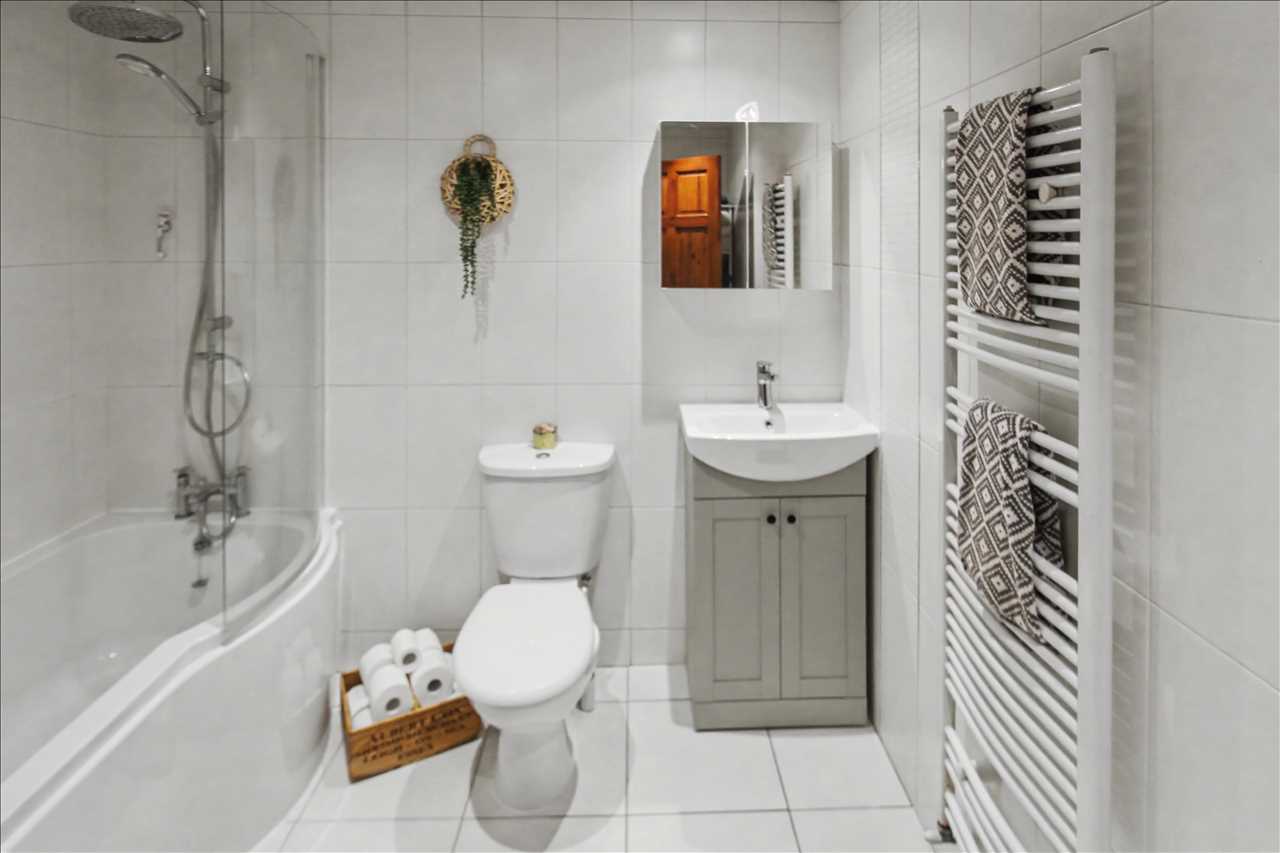 White suite comprising of a panelled bath with shower over, low flush wc, and wash hand basin with storage below. Heated towel rail. Tiling to the floor and tiling to the walls. Under floor heating.