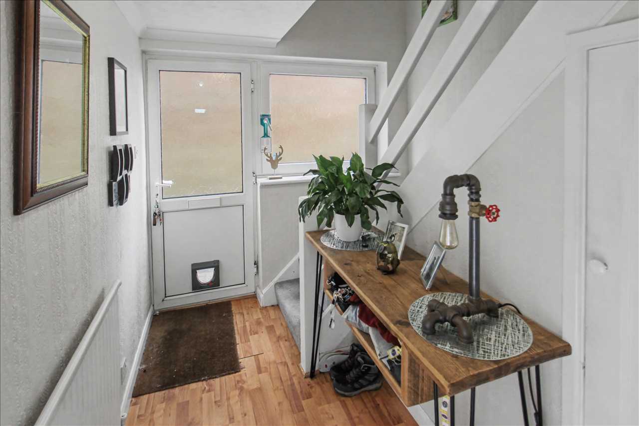 Door to the side elevation, staircase leading to the to the first floor, under stairs storage cupboard housing the alarm, central heating radiator, door to lounge diner, UPVC window to side.