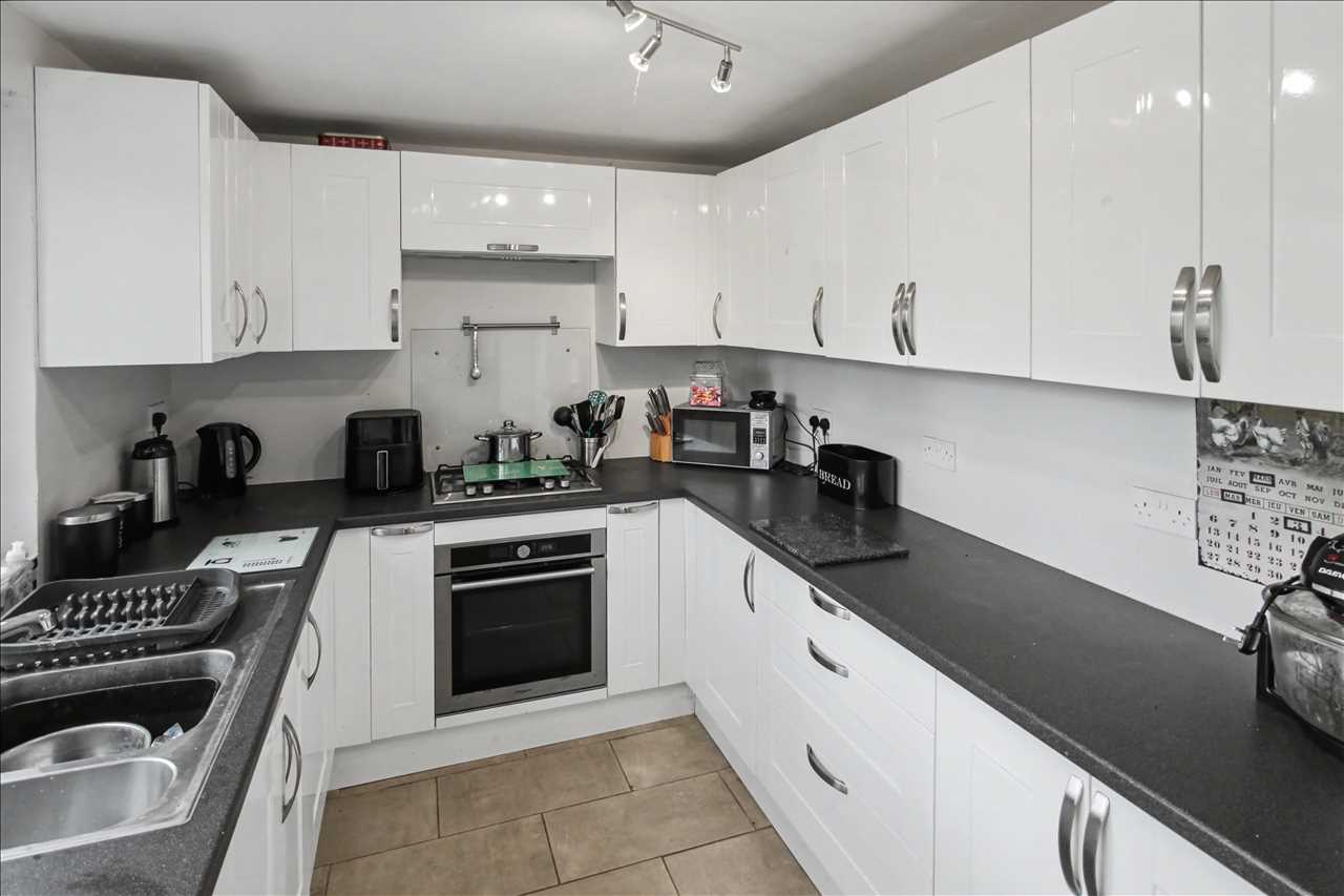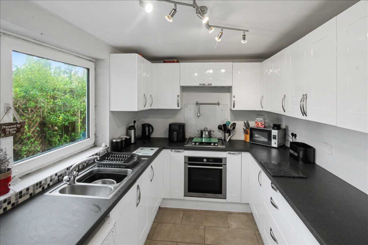UPVC window to rear elevation, a modern refitted fitted white kitchen comprising of base and wall units with roll top work surface, sink unit, integrated new oven, hob and extractor above, plumbing for washing machine, space for fridge, part tiled walls, tiled flooring.
