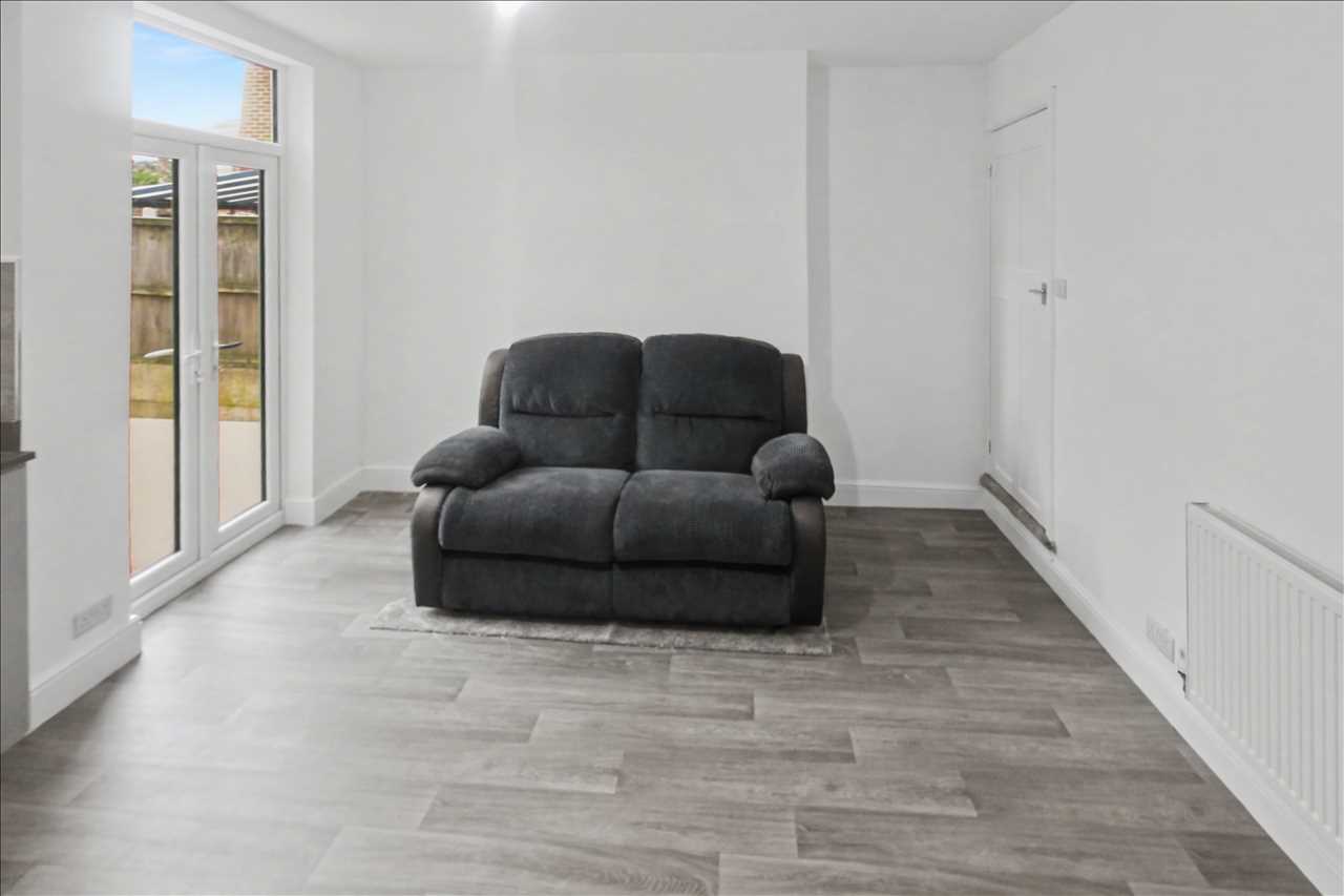 With door and stairs leading off to the first floor accommodation, wood effect floor covering, radiator and double glazed French doors leading out to the rear garden