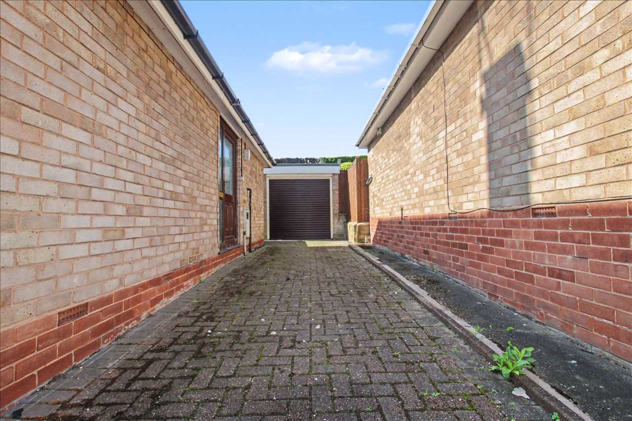 Block paved driveway to the side leads to the entrance door and the brick detached garage. The garage has double glazed windows, power, lighting and electric door.