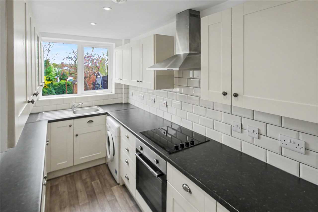 The spacious re fitted kitchen has a stainless steel sink unit with mixer taps and side drainer inset into work surfaces, a range of base and wall units, built in oven hob and extractor hood, tiled splash back areas, plumbing for automatic washing machine. Spotlights to the ceiling and central heating radiator.