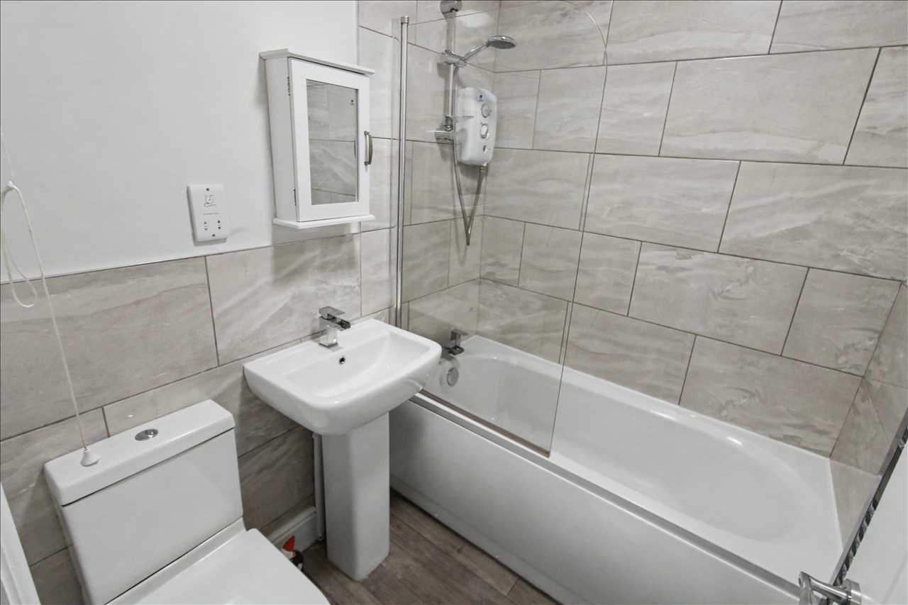 Re fiitted white suite comprising of panelled bath with shower over, pedestal wash hand basin and low flush wc. Tiling to the walls, shaver point and chrome heated towel rail.