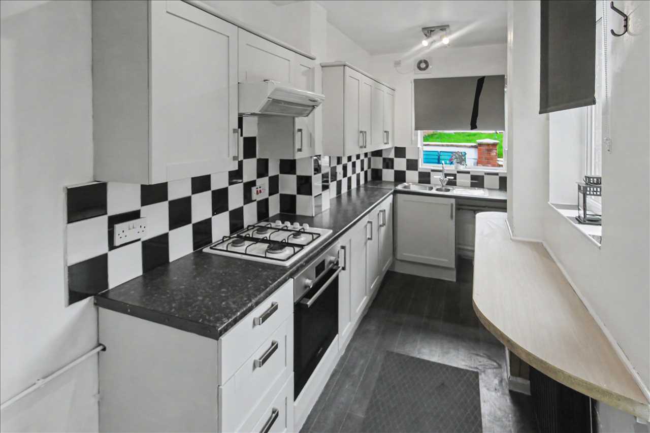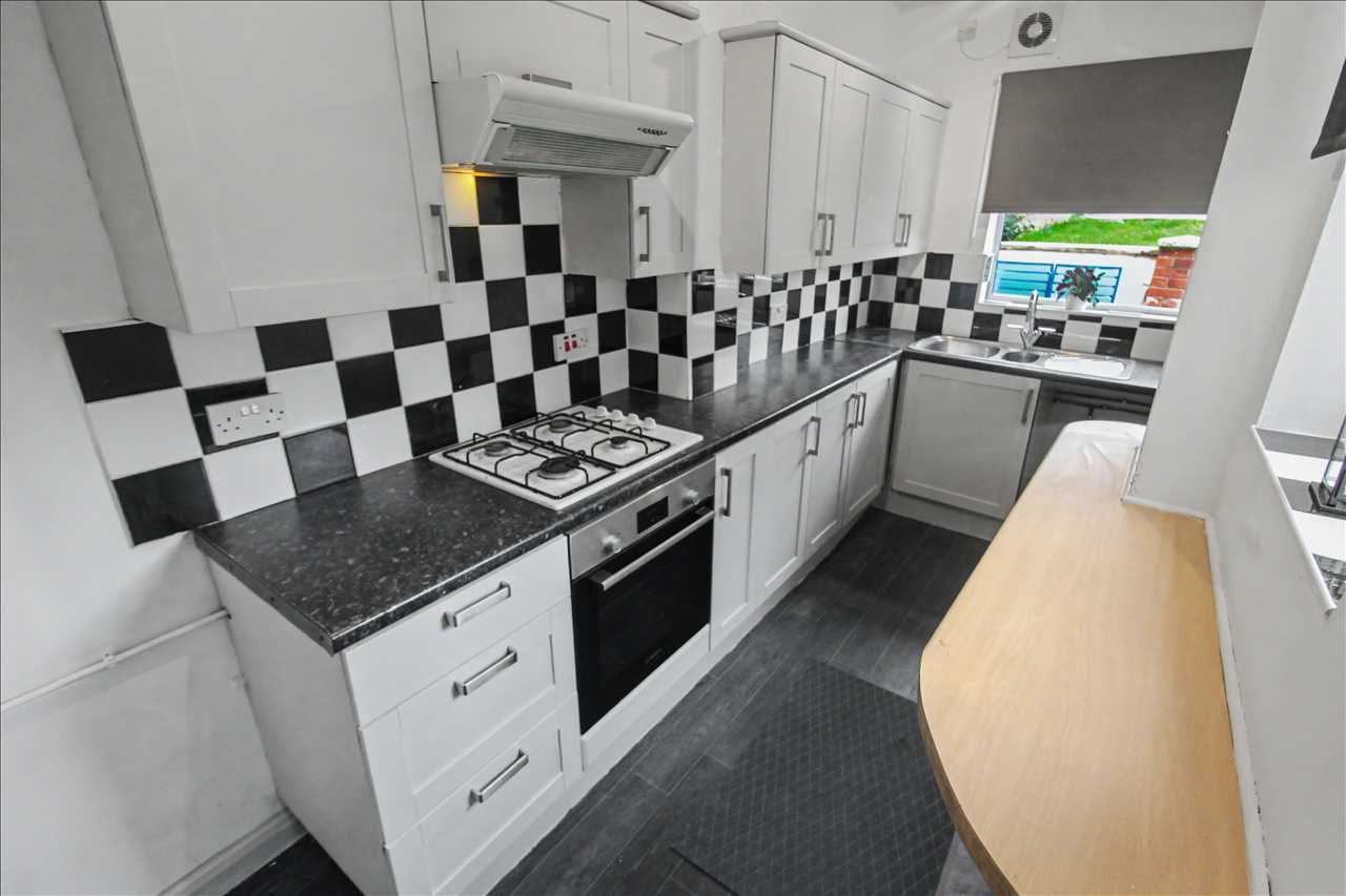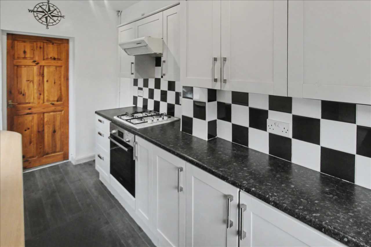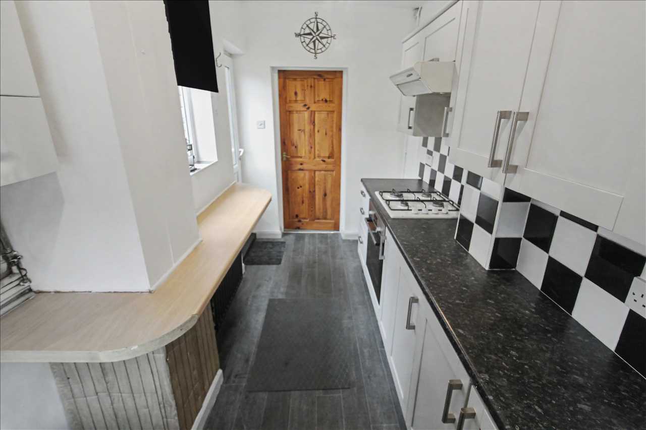 Having a double glazed window to the rear elevation and a double glazed window to the side elevation. upvc door leads ot the enclosed rear garden. The kitchen comprises of a and a half bowl sink unit with mixer taps and side drainer inset into roll edge work surfaces, a range of base and wall units with built in oven hob and extractor hood. Space for fridge/freezer and plumbing for automatic washing machine. Wood effect floor covering.