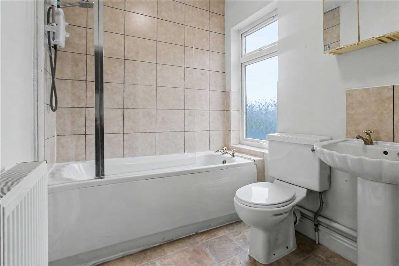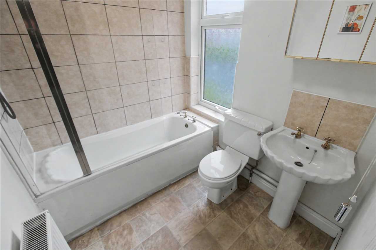 Frosted double glazed window, three piece suite comprising of panelled bath with shower over, pedestal wash hand basin and low flush wc. Tiled splash back areas. Central heating radiator.