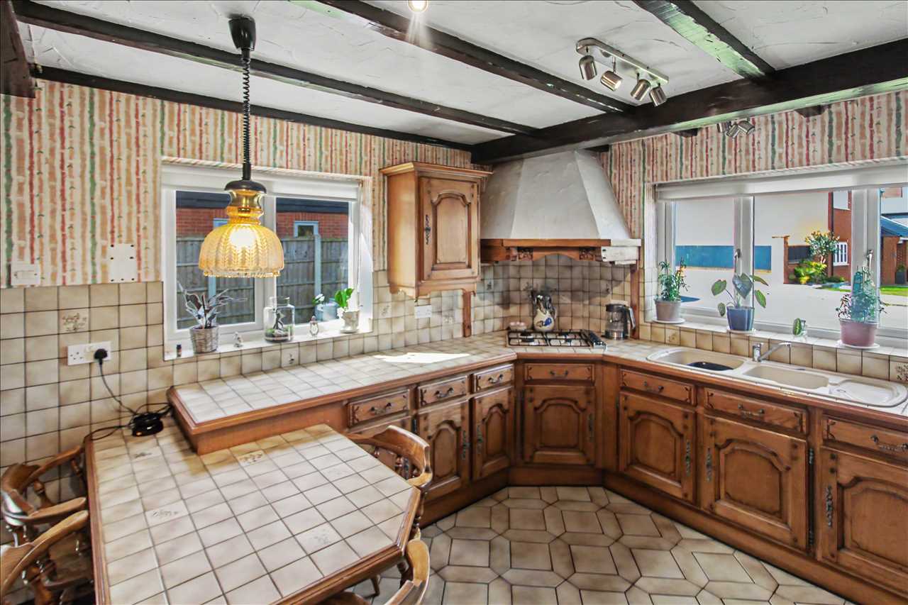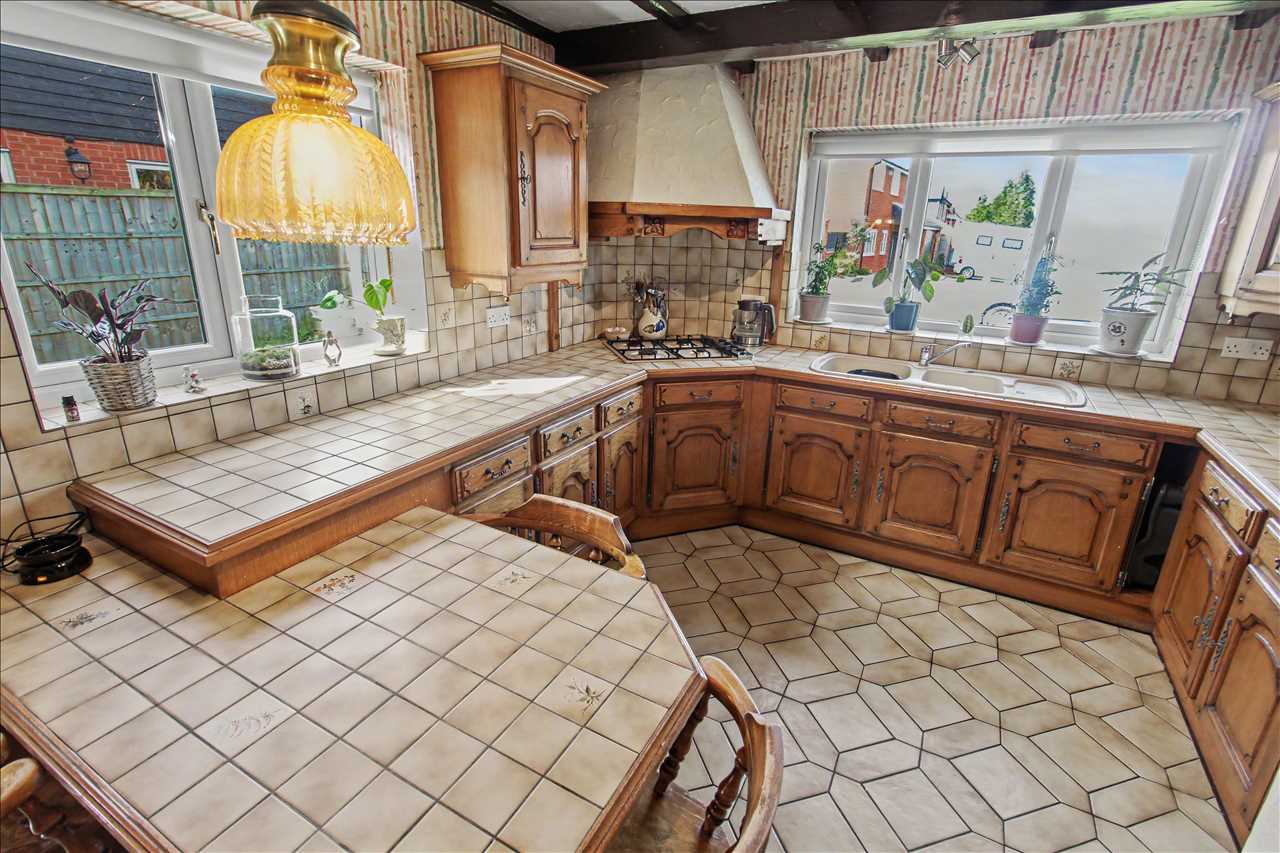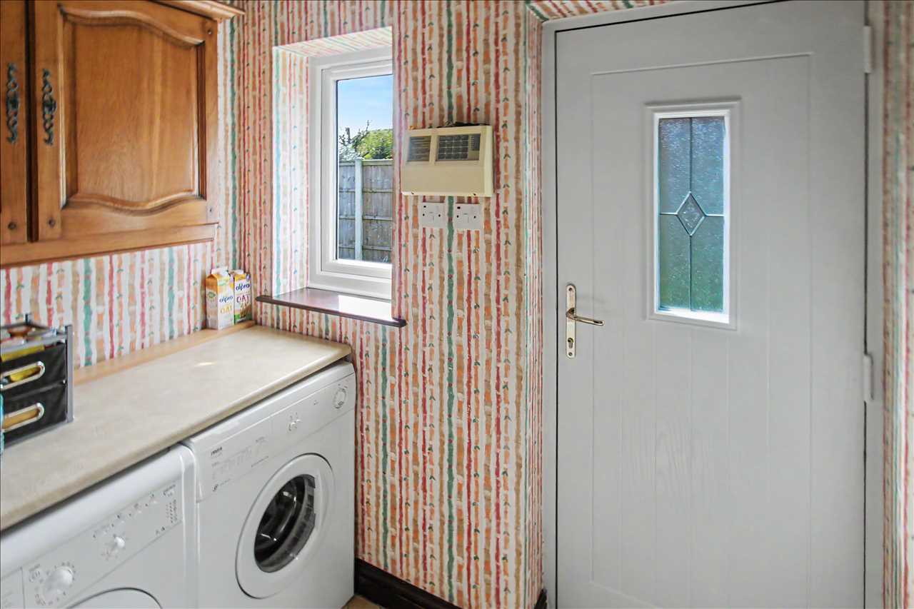 The spacious breakfast kitchen comprises of twin sink unit with mixer taps and drainer inset into tiled work tops which extends to the breakfast area, a range of base and wall units, built in oven hob and extractor hood, space for fridge/freezer, central heating radiator. Double glazed windows to the front and side elevations. Door leads to the utility room.