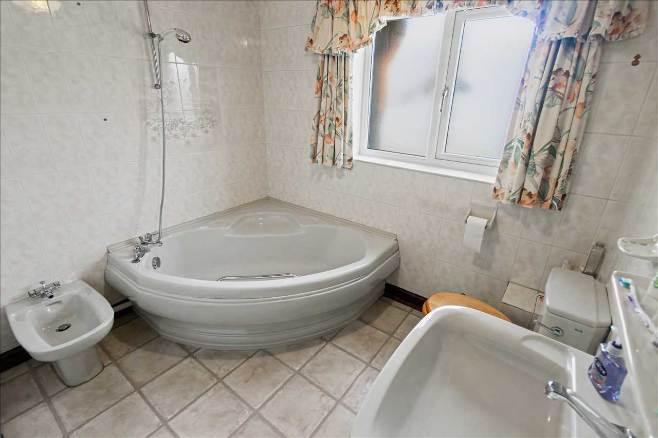 Frosted double glazed window with the bathroom comprising of a corner bath with shower connections over, bidet, low flush wc and wash hand basin. Tiling to the floor and tiling to the walls. Central heating radiator.